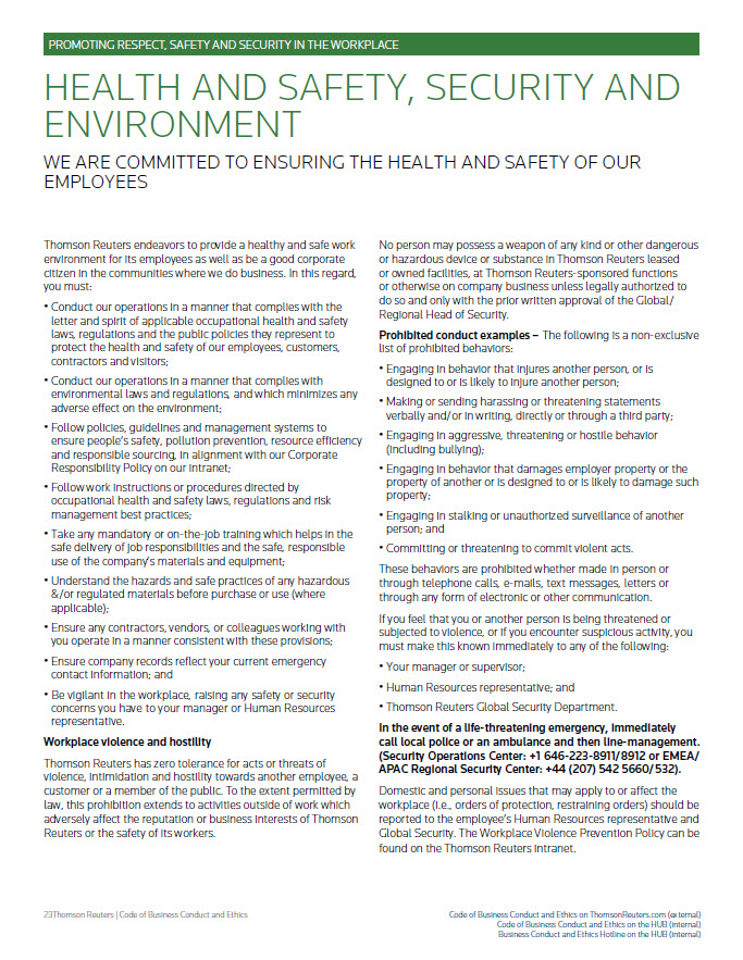 PROMOTING RESPECT, SAFETY AND SECURITY IN THE WORKPLACE HEALTH AND SAFETY, SECURITY AND ENVIRONMENT WE ARE COMMITTED TO ENSURING THE HEALTH AND SAFETY OF OUR EMPLOYEES Thomson Reuters endeavors to provide a healthy and safe work environment for its employees as well as be a good corporate citizen in the communities where we do business. In this regard, you must: • Conduct our operations in a manner that complies with the letter and spirit of applicable occupational health and safety laws, regulations and the public policies they represent to protect the health and safety of our employees, customers, contractors and visitors; • Conduct our operations in a manner that complies with environmental laws and regulations, and which minimizes any adverse effect on the environment; • Follow policies, guidelines and management systems to ensure people’s safety, pollution prevention, resource efficiency and responsible sourcing, in alignment with our Corporate Responsibility Policy on our intranet; • Follow work instructions or procedures directed by occupational health and safety laws, regulations and risk management best practices; • Take any mandatory or on-the-job training which helps in the safe delivery of job responsibilities and the safe, responsible use of the company’s materials and equipment; • Understand the hazards and safe practices of any hazardous &/or regulated materials before purchase or use (where applicable); • Ensure any contractors, vendors, or colleagues working with you operate in a manner consistent with these provisions; • Ensure company records reflect your current emergency contact information; and • Be vigilant in the workplace, raising any safety or security concerns you have to your manager or Human Resources representative. Workplace violence and hostility Thomson Reuters has zero tolerance for acts or threats of violence, intimidation and hostility towards another employee, a customer or a member of the public. To the extent permitted by law, this prohibition extends to activities outside of work which adversely affect the reputation or business interests of Thomson Reuters or the safety of its workers. No person may possess a weapon of any kind or other dangerous or hazardous device or substance in Thomson Reuters leased or owned facilities, at Thomson Reuters-sponsored functions or otherwise on company business unless legally authorized to do so and only with the prior written approval of the Global/ Regional Head of Security. Prohibited conduct examples – The following is a non-exclusive list of prohibited behaviors: • Engaging in behavior that injures another person, or is designed to or is likely to injure another person; • Making or sending harassing or threatening statements verbally and/or in writing, directly or through a third party; • Engaging in aggressive, threatening or hostile behavior (including bullying); • Engaging in behavior that damages employer property or the property of another or is designed to or is likely to damage such property; • Engaging in stalking or unauthorized surveillance of another person; and • Committing or threatening to commit violent acts. These behaviors are prohibited whether made in person or through telephone calls, e-mails, text messages, letters or through any form of electronic or other communication. If you feel that you or another person is being threatened or subjected to violence, or if you encounter suspicious activity, you must make this known immediately to any of the following: • Your manager or supervisor; • Human Resources representative; and • Thomson Reuters Global Security Department. In the event of a life-threatening emergency, immediately call local police or an ambulance and then line-management. (Security Operations Center: +1 646-223-8911/8912 or EMEA/ APAC Regional Security Center: +44 (207) 542 5660/532).Domestic and personal issues that may apply to or affect the workplace (i.e., orders of protection, restraining orders) should be reported to the employee’s Human Resources representative and Global Security. The Workplace Violence Prevention Policy can be found on the Thomson Reuters intranet. Thomson Reuters | Code of Business Conduct and Ethics Code of Business Conduct and Ethics on ThomsonReuters.com (external) Code of Business Conduct and Ethics on the HUB (internal) Business Conduct and Ethics Hotline on the HUB (internal)