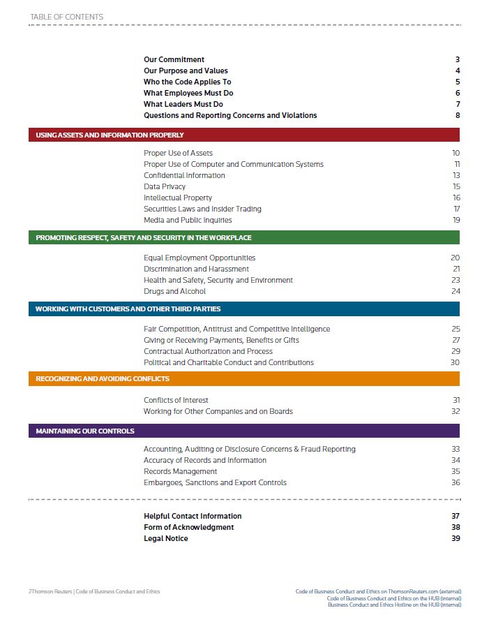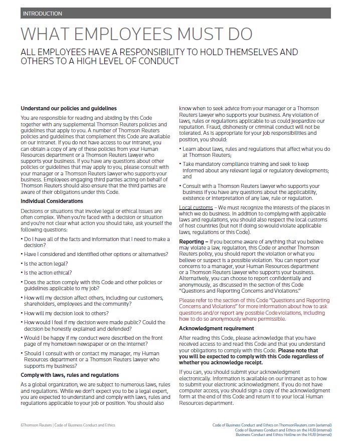 INTRODUCTION WHAT EMPLOYEES MUST DO ALL EMPLOYEES HAVE A RESPONSIBILITY TO HOLD THEMSELVES AND OTHERS TO A HIGH LEVEL OF CONDUCT Understand our policies and guidelines You are responsible for reading and abiding by this Code together with any supplemental Thomson Reuters policies and guidelines that apply to you. A number of Thomson Reuters policies and guidelines that complement this Code are available on our intranet. If you do not have access to our intranet, you can obtain a copy of any of these policies from your Human Resources department or a Thomson Reuters lawyer who supports your business. If you have any questions about other policies or guidelines that may apply to you, please consult with your manager or a Thomson Reuters lawyer who supports your business. Employees engaging third parties acting on behalf of Thomson Reuters should also ensure that the third parties are aware of their obligations under this Code. Individual Considerations Decisions or situations that involve legal or ethical issues are often complex. When you’re faced with a decision or situation and you’re not clear what action you should take, ask yourself the following questions: • Do I have all of the facts and information that I need to make a decision? • Have I considered and identified other options or alternatives? • Is the action legal? • Is the action ethical? • Does the action comply with this Code and other policies or guidelines applicable to my job? • How will my decision affect others, including our customers, shareholders, employees and the community? • How will my decision look to others? • How would I feel if my decision were made public? Could the decision be honestly explained and defended? • Would I be happy if my conduct were described on the front page of my hometown newspaper or on the internet? • Should I consult with or contact my manager, my Human Resources department or a Thomson Reuters lawyer who supports my business?Comply with laws, rules and regulations As a global organization, we are subject to numerous laws, rules and regulations. While we don’t expect you to be a legal expert, you are expected to understand and comply with laws, rules and regulations applicable to your job or position. You should also know when to seek advice from your manager or a Thomson Reuters lawyer who supports your business. Any violation of laws, rules or regulations applicable to us could jeopardize our reputation. Fraud, dishonesty or criminal conduct will not be tolerated. As is appropriate for your job responsibilities and position, you should: • Learn about laws, rules and regulations that affect what you do at Thomson Reuters; • Take mandatory compliance training and seek to keep informed about any relevant legal or regulatory developments; and • Consult with a Thomson Reuters lawyer who supports your business if you have any questions about the applicability, existence or interpretation of any law, rule or regulation. Local customs – We must recognize the interests of the places in which we do business. In addition to complying with applicable laws and regulations, you should also respect the local customs of host countries (but not if doing so would violate applicable laws, regulations or this Code). Reporting – If you become aware of anything that you believe may violate a law, regulation, this Code or another Thomson Reuters policy, you should report the violation or what you believe or suspect is a possible violation. You can report your concerns to a manager, your Human Resources department or a Thomson Reuters lawyer who supports your business. Alternatively, you can choose to report confidentially and anonymously, as discussed in the section of this Code “Questions and Reporting Concerns and Violations.” Please refer to the section of this Code “Questions and Reporting Concerns and Violations” for more information about how to ask questions and/or report any possible Code violations, including how to do so anonymously where permissible. Acknowledgment requirement After reading this Code, please acknowledge that you have received access to and read this Code and that you understand your obligations to comply with this Code. Please note that you will be expected to comply with this Code regardless of whether you acknowledge receipt. If you can, you should submit your acknowledgment electronically. Information is available on our intranet as to how to submit your electronic acknowledgment. If you do not have computer access, you should sign a copy of the acknowledgment form at the end of this Code and return it to your local Human Resources department. Thomson Reuters | Code of Business Conduct and Ethics Code of Business Conduct and Ethics on ThomsonReuters.com (external) Code of Business Conduct and Ethics on the HUB (internal) Business Conduct and Ethics Hotline on the HUB (internal)