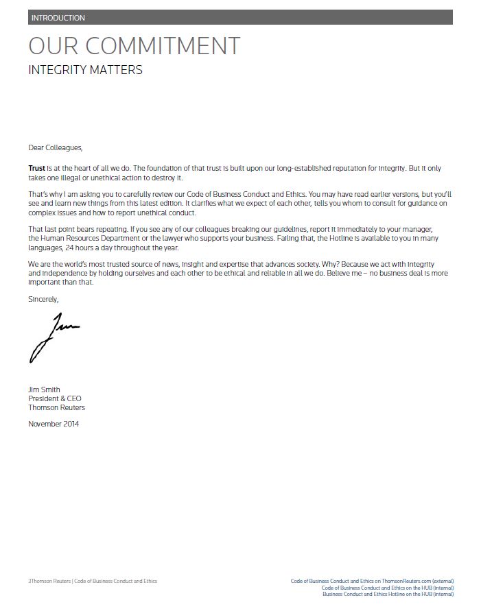INTRODUCTION OUR COMMITMENT INTEGRITY MATTERS Dear Colleagues, Trust is at the heart of all we do. The foundation of that trust is built upon our long-established reputation for integrity. But it only takes one illegal or unethical action to destroy it. That’s why I am asking you to carefully review our Code of Business Conduct and Ethics. You may have read earlier versions, but you’ll see and learn new things from this latest edition. It clarifies what we expect of each other, tells you whom to consult for guidance on complex issues and how to report unethical conduct. That last point bears repeating. If you see any of our colleagues breaking our guidelines, report it immediately to your manager, the Human Resources Department or the lawyer who supports your bss. Failing that, the Hotline is available to you in many languages, 24 hours a day throughout the year. We are the world’s most trusted source of news, insight and expertise that advances society. Why? Because we act with integrity and independence by holding ourselves and each other to be ethical and reliable in all we do. Believe me – no business deal is more important than that. Sincerely, /S/ Jim Smith Jim Smith President & CEO Thomson Reuters November 2014 Thomson Reuters | Code of Business Conduct and Ethics Code of Business Conduct and Ethics on ThomsonReuters.com (external) Code of Business Conduct and Ethics on the HUB (internal) Business Conduct and Ethics Hotline on the HUB (internal)
