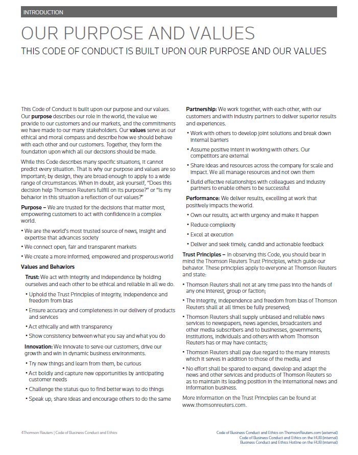 INTRODUCTION OUR PURPOSE AND VALUES THIS CODE OF CONDUCT IS BUILT UPON OUR PURPOSE AND OUR VALUES This Code of Conduct is built upon our purpose and our values. Our purpose describes our role in the world, the value we provide to our customers and our markets, and the commitments we have made to our many stakeholders. Our values serve as our ethical and moral compass and describe how we should behave with each other and our customers. Together, they form the foundation upon which all our decisions should be made. While this Code describes many specific situations, it cannot predict every situation. That is why our purpose and values are so important; by design, they are broad enough to apply to a wide range of circumstances. When in doubt, ask yourself, “Does this decision help Thomson Reuters fulfill on its purpose?” or “Is my behavior in this situation a reflection of our values?” Purpose – We are trusted for the decisions that matter most, empowering customers to act with confidence in a complex world. • We are the world’s most trusted source of news, insight and expertise that advances society • We connect open, fair and transparent markets • We create a more informed, empowered and prosperous world Values and Behaviors Trust: We act with integrity and independence by holding ourselves and each other to be ethical and reliable in all we do. • Uphold the Trust Principles of integrity, independence and freedom from bias • Ensure accuracy and completeness in our delivery of products and services • Act ethically and with transparency • Show consistency between what you say and what you do Innovation: We innovate to serve our customers, drive our growth and win in dynamic business environments • Try new things and learn from them, be curious • Act boldly and capture new opportunities by anticipating customer needs • Challenge the status quo to find better ways to do things • Speak up, share ideas and encourage others to do the same Partnership: We work together, with each other, with our customers and with industry partners to deliver superior results and experiences. • Work with others to develop joint solutions and break down internal barriers • Assume positive intent in working with others. Our competitors are external • Share ideas and resources across the company for scale and impact. We all manage resources and not own them • Build effective relationships with colleagues and industry partners to enable others to be successful Performance: We deliver results, excelling at work that positively impacts the world. • Own our results, act with urgency and make it happen • Reduce complexity • Excel at execution • Deliver and seek timely, candid and actionable feedback Trust Principles – In observing this Code, you should bear in mind the Thomson Reuters Trust Principles, which guide our behavior. These principles apply to everyone at Thomson Reuters and state: • Thomson Reuters shall not at any time pass into the hands of any one interest, group or faction; • The integrity, independence and freedom from bias of Thomson Reuters shall at all times be fully preserved; • Thomson Reuters shall supply unbiased and reliable news services to newspapers, news agencies, broadcasters and other media subscribers and to businesses, governments, institutions, individuals and others with whom Thomson Reuters has or may have contacts; • Thomson Reuters shall pay due regard to the many interests which it serves in addition to those of the media; and • No effort shall be spared to expand, develop and adapt the news and other services and products of Thomson Reuters so as to maintain its leading position in the international news and information business. More information on the Trust Principles can be found at www.thomsonreuters.com. Thomson Reuters | Code of Business Conduct and Ethics Code of Business Conduct and Ethics on ThomsonReuters.com (external) Code of Business Conduct and Ethics on the HUB (internal) Business Conduct and Ethics Hotline on the HUB (internal)