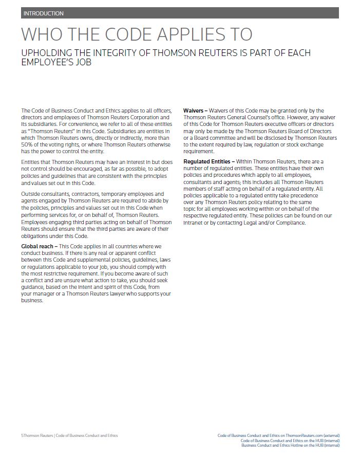 INTRODUCTION WHO THE CODE APPLIES TO UPHOLDING THE INTEGRITY OF THOMSON REUTERS IS PART OF EACH EMPLOYEE’S JOB The Code of Business Conduct and Ethics applies to all officers, directors and employees of Thomson Reuters Corporation and its subsidiaries. For convenience, we refer to all of these entities as “Thomson Reuters” in this Code. Subsidiaries are entities in which Thomson Reuters owns, directly or indirectly, more than 50% of the voting rights, or where Thomson Reuters otherwise has the power to control the entity. Entities that Thomson Reuters may have an interest in but does not control should be encouraged, as far as possible, to adopt policies and guidelines that are consistent with the principles and values set out in this Code. Outside consultants, contractors, temporary employees and agents engaged by Thomson Reuters are required to abide by the policies, principles and values set out in this Code when performing services for, or on behalf of, Thomson Reuters. Employees engaging third parties acting on behalf of Thomson Reuters should ensure that the third parties are aware of their obligations under this Code. Global reach – This Code applies in all countries where we conduct business. If there is any real or apparent conflict between this Code and supplemental policies, guidelines, laws or regulations applicable to your job, you should comply with the most restrictive requirement. If you become aware of such a conflict and are unsure what action to take, you should seek guidance, based on the intent and spirit of this Code, from your manager or a Thomson Reuters lawyer who supports your business. Waivers – Waivers of this Code may be granted only by the Thomson Reuters General Counsel’s office. However, any waiver of this Code for Thomson Reuters executive officers or directors may only be made by the Thomson Reuters Board of Directors or a Board committee and will be disclosed by Thomson Reuters to the extent required by law, regulation or stock exchange requirement. Regulated Entities – Within Thomson Reuters, there are a number of regulated entities. These entities have their own policies and procedures which apply to all employees, consultants and agents; this includes all Thomson Reuters members of staff acting on behalf of a regulated entity. All policies applicable to a regulated entity take precedence over any Thomson Reuters policy relating to the same topic for all employees working within or on behalf of the respective regulated entity. These policies can be found on our intranet or by contacting Legal and/or Compliance. Thomson Reuters | Code of Business Conduct and Ethics Code of Business Conduct and Ethics on ThomsonReuters.com (external) Code of Business Conduct and Ethics on the HUB (internal) Business Conduct and Ethics Hotline on the HUB (internal)