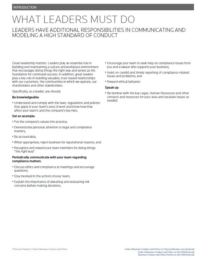 INTRODUCTION WHAT LEADERS MUST DO LEADERS HAVE ADDITIONAL RESPONSIBILITIES IN COMMUNICATING AND MODELING A HIGH STANDARD OF CONDUCT Great leadership matters. Leaders play an essential role in building and maintaining a culture and workplace environment that encourages doing things the right way and serves as the foundation for continued success. In addition, great leaders play a key role in building valuable, trust-based relationships with our customers, the communities in which we operate, our shareholders and other stakeholders. Specifically, as a leader, you should: Be knowledgeable: • Understand and comply with the laws, regulations and policies that apply in your team’s area of work and know how they affect your team’s and the company’s key risks. Set an example: • Put the company’s values into practice; • Demonstrate personal attention to legal and compliance matters; • Be accountable; • When appropriate, reject business for reputational reasons; and • Recognize and reward your team members for doing things “the right way”. Periodically communicate with your team regarding compliance matters: • Discuss ethics and compliance at meetings and encourage questions; • Stay involved in the actions of your team; • Explain the importance of elevating and evaluating risk concerns before making decisions; • Encourage your team to seek help on compliance issues from you and a lawyer who supports your business; • Insist on candid and timely reporting of compliance-related issues and problems; and • Reward ethical behavior. Speak up: • Be familiar with the key Legal, Human Resources and other contacts and resources for your area and escalate issues as needed. Thomson Reuters | Code of Business Conduct and Ethics Code of Business Conduct and Ethics on ThomsonReuters.com (external) Code of Business Conduct and Ethics on the HUB (internal) Business Conduct and Ethics Hotline on the HUB (internal)