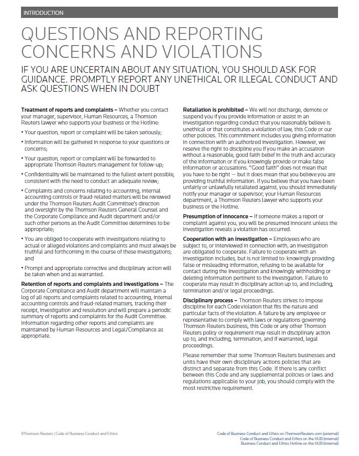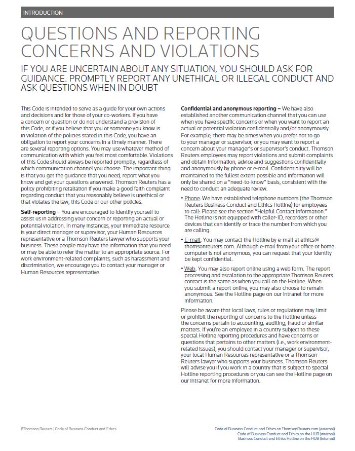 INTRODUCTION QUESTIONS AND REPORTING CONCERNS AND VIOLATIONS IF YOU ARE UNCERTAIN ABOUT ANY SITUATION, YOU SHOULD ASK FOR GUIDANCE. PROMPTLY REPORT ANY UNETHICAL OR ILLEGAL CONDUCT AND ASK QUESTIONS WHEN IN DOUBT This Code is intended to serve as a guide for your own actions and decisions and for those of your co-workers. If you have a concern or question or do not understand a provision of this Code, or if you believe that you or someone you know is in violation of the policies stated in this Code, you have an obligation to report your concerns in a timely manner. There are several reporting options. You may use whatever method of communication with which you feel most comfortable. Violations of this Code should always be reported promptly, regardless of which communication channel you choose. The important thing is that you get the guidance that you need, report what you know and get your questions answered. Thomson Reuters has a policy prohibiting retaliation if you make a good faith complaint regarding conduct that you reasonably believe is unethical or that violates the law, this Code or our other policies. Self-reporting – You are encouraged to identify yourself to assist us in addressing your concern or reporting an actual or potential violation. In many instances, your immediate resource is your direct manager or supervisor, your Human Resources representative or a Thomson Reuters lawyer who supports your business. These people may have the information that you need or may be able to refer the matter to an appropriate source. For work environment-related complaints, such as harassment and discrimination, we encourage you to contact your manager or Human Resources representative. Confidential and anonymous reporting – We have also established another communication channel that you can use when you have specific concerns or when you want to report an actual or potential violation confidentially and/or anonymously. For example, there may be times when you prefer not to go to your manager or supervisor, or you may want to report a concern about your manager’s or supervisor’s conduct. Thomson Reuters employees may report violations and submit complaints and obtain information, advice and suggestions confidentially and anonymously by phone or e-mail. Confidentiality will be maintained to the fullest extent possible and information will only be shared on a “need-to-know” basis, consistent with the need to conduct an adequate review. • Phone. We have established telephone numbers (the Thomson Reuters Business Conduct and Ethics Hotline) for employees to call: Please see the section “Helpful Contact Information.” The Hotline is not equipped with caller-ID, recorders or other devices that can identify or trace the number from which you are calling. • E-mail. You may contact the Hotline by e-mail at ethics@ thomsonreuters.com. Although e-mail from your office or home computer is not anonymous, you can request that your identity be kept confidential. • Web. You may also report online using a web form. The report processing and escalation to the appropriate Thomson Reuters contact is the same as when you call on the Hotline. When you submit a report online, you may also choose to remain anonymous. See the Hotline page on our intranet for more information. Please be aware that local laws, rules or regulations may limit or prohibit the reporting of concerns to the Hotline unless the concerns pertain to accounting, auditing, fraud or similar matters. If you’re an employee in a country subject to these special Hotline reporting procedures and have concerns or questions that pertains to other matters (i.e., work environment- related issues), you should contact your manager or supervisor, your local Human Resources representative or a Thomson Reuters lawyer who supports your business. Thomson Reuters will advise you if you work in a country that is subject to special Hotline reporting procedures or you can see the Hotline page on our intranet for more information.Thomson Reuters | Code of Business Conduct and Ethics Code of Business Conduct and Ethics on ThomsonReuters.com (external) Code of Business Conduct and Ethics on the HUB (internal) Business Conduct and Ethics Hotline on the HUB (internal)