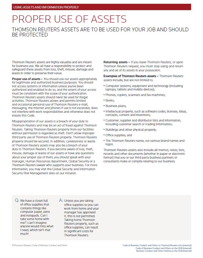 USING ASSETS AND INFORMATION PROPERLY PROPER USE OF ASSETS THOMSON REUTERS ASSETS ARE TO BE USED FOR YOUR JOB AND SHOULD BE PROTECTED Thomson Reuters assets are highly valuable and are meant for business use. We all have a responsibility to protect and safeguard these assets from loss, theft, misuse, damage and waste in order to preserve their value. Proper use of assets – You should use our assets appropriately for legitimate and authorized business purposes. You should not access systems or information unless you’ve been authorized and enabled to do so, and the extent of your access must be consistent with the scope of your authorization. Thomson Reuters assets should never be used for illegal activities. Thomson Reuters allows and permits limitedand occasional personal use of Thomson Reuters e-mail, messaging, the internet and phones if use is not excessive, does not interfere with work responsibilities and otherwise does not violate this Code.isappropriation of our assets is a breach of your duty to Thomson Reuters and may be an act of fraud against Thomson Reuters. Taking Thomson Reuters property from our facilities without permission is regarded as theft. Don’t allow improper third party use of Thomson Reuters property. Thomson Reuters property should be secured. In addition, carelessness or waste of Thomson Reuters assets may also be a breach of your duty to Thomson Reuters. If you become aware of loss, theft, misuse, damage or waste of our assets or have any questions about your proper use of them, you should speak with your manager, Human Resources department, Global Security or a Thomson Reuters lawyer who supports your business. For more information, you may visit the Global Security and Information Security Risk Management sites on our intranet. Returning assets – If you leave Thomson Reuters, or upon Thomson Reuters request, you must stop using and return any and all of its assets in your possession. Examples of Thomson Reuters assets – Thomson Reuters assets include, but are not limited to: • Computer systems, equipment and technology (including laptops, tablets and mobile devices); • Phones, copiers, scanners and fax machines; • Books; • Business plans; • Intellectual property, such as software codes, licenses, ideas, concepts, content and inventions; • Customer, supplier and distributor lists and information, including customer search or trading information; • Buildings and other physical property; • Office supplies; and • The Thomson Reuters name, our various brand names and logos. Thomson Reuters assets also include all memos, notes, lists, records and other documents (whether in paper or electronic format) that you or our third party business partners or consultants make or compile relating to our business. Q: We have a closet full of office supplies that contains things like computer paper, pens and notepads. Can I take some home with me? I can’t imagine anyone would miss what I need, which isn’t that much! A: Unless you are taking office supplies so you can work from home and your manager has approved it, this is not permitted. Taking home Thomson Reuters property, such as office supplies, can result in significant costs for Thomson Reuters. Thomson Reuters | Code of Business Conduct and Ethics Code of Business Conduct and Ethics on ThomsonReuters.com (external) Code of Business Conduct and Ethics on the HUB (internal) Business Conduct and Ethics Hotline on the HUB (internal)