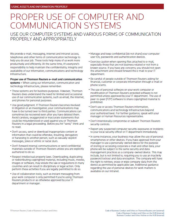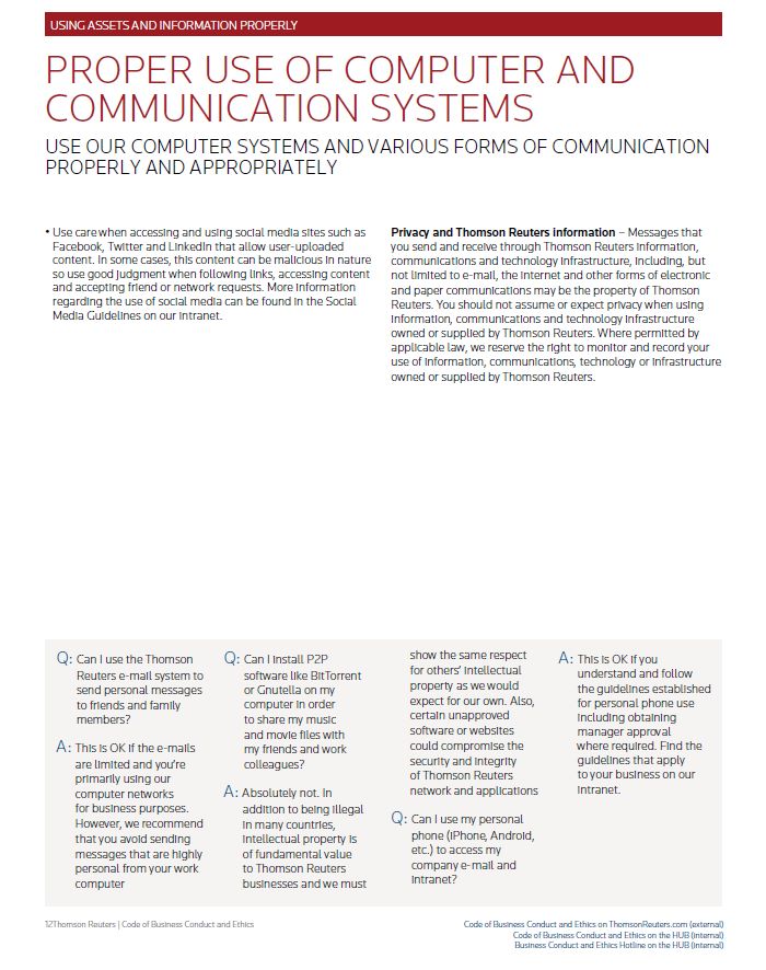 USING ASSETS AND INFORMATION PROPERLY PROPER USE OF COMPUTER AND COMMUNICATION SYSTEMS USE OUR COMPUTER SYSTEMS AND VARIOUS FORMS OF COMMUNICATION PROPERLY AND APPROPRIATELY • Use care when accessing and using social media sites such as Facebook, Twitter and LinkedIn that allow user-uploaded content. In some cases, this content can be malicious in nature so use good judgment when following links, accessing content and accepting friend or network requests. More information regarding the use of social media can be found in the Social Media Guidelines on our intranet. Privacy and Thomson Reuters information – Messages that you send and receive through Thomson Reuters information, communications and technology infrastructure, including, but not limited to e-mail, the internet and other forms of electronic and paper communications may be the property of Thomson Reuters. You should not assume or expect privacy when using information, communications and technology infrastructure owned or supplied by Thomson Reuters. Where permitted by applicable law, we reserve the right to monitor and record your use of information, communications, technology or infrastructure owned or supplied by Thomson Reuters. Q: Can I use the Thomson Reuters e-mail system to send personal messages to friends and family members? A: This is OK if the e-mails are limited and you’re primarily using our computer networks for business purposes. However, we recommend that you avoid sending messages that are highly personal from your work computer Q: Can I install P2P software like BitTorrent or Gnutella on my computer in order to share my music and movie files with my friends and work colleagues? A: Absolutely not. In addition to being illegal in many countries, intellectual property is of fundamental value to Thomson Reuters businesses and we must show the same respect for others’ intellectual property as we would expect for our own. Also, certain unapproved software or websites could compromise the security and integrity of Thomson Reuters network and applications Q: Can I use my personal phone (iPhone, Android, etc.) to access my company e-mail and intranet? A: This is OK if you understand and follow the guidelines established for personal phone use including obtaining manager approval where required. Find the guidelines that apply to your business on our intranet. Thomson Reuters | Code of Business Conduct and Ethics Code of Business Conduct and Ethics on ThomsonReuters.com (external) Code of Business Conduct and Ethics on the HUB (internal) Business Conduct and Ethics Hotline on the HUB (internal)