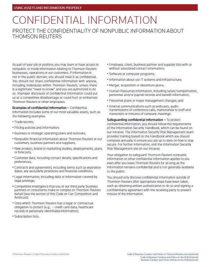 USING ASSETS AND INFORMATION PROPERLY CONFIDENTIAL INFORMATION PROTECT THE CONFIDENTIALITY OF NONPUBLIC INFORMATION ABOUT THOMSON REUTERS As part of your job or position, you may learn or have access to nonpublic or inside information relating to Thomson Reuters businesses, operations or our customers. If information is not in the public domain, you should treat it as confidential. You should not share confidential information with anyone, including individuals within Thomson Reuters, unless there is a legitimate “need-to-know” and you are authorized to do so. Improper disclosure of confidential information could put us at a competitive disadvantage or could hurt or embarrass Thomson Reuters or other employees. Examples of confidential information – Confidential information includes some of our most valuable assets, such as the following examples: • Trade secrets; • Pricing policies and information; • Business or strategic operating plans and outlooks; • Nonpublic financial information about Thomson Reuters or our customers, business partners and suppliers; • New product, brand or marketing studies, developments, plans or forecasts; • Customer data, including contact details, specifications and preferences; • Contracts and agreements, including terms such as expiration dates, any exclusivity provisions and financial conditions; • Legal information, including data or information covered by legal privilege; • Competitive intelligence that you or our third party business partners or consultants make or compile on Thomson Reuters behalf (see the section of this Code on Fair Competition and Antitrust); • Data which Thomson Reuters has a legal or contractual obligation to protect (e.g., – credit card data, healthcare records or personally identifiable information); • Subscription lists; • Employee, client, business partner and supplier lists with or without associated contact information; • Software or computer programs; • Information about our IT systems and infrastructure; • Merger, acquisition or divestiture plans; • Human Resources information, including salary/compensation, personnel and/or payroll records and benefit information; • Personnel plans or major management changes; and • Internal communications such as webcasts, audio transmissions of conference calls, memoranda to staff and transcripts or minutes of company meetings. Safeguarding confidential information – To protect confidential information, you should follow the requirements of the Information Security Handbook, which can be found on our intranet. The Information Security Risk Management team provides training based on the Handbook which you should complete annually to ensure you are up to date on how to stay secure. For further information, visit the Information Security Risk Management site on our intranet. Your obligation to safeguard Thomson Reuters nonpublic information or other confidential information applies to you even after you leave Thomson Reuters for as long as the information remains confidential and is not generally available to the public. You should only disclose confidential information outside of Thomson Reuters after appropriate steps have been taken, such as obtaining written authorization to do so and signing a confidentiality agreement with the receiving party to prevent misuse of the information. Thomson Reuters | Code of Business Conduct and Ethics Code of Business Conduct and Ethics on ThomsonReuters.com (external) Code of Business Conduct and Ethics on the HUB (internal) Business Conduct and Ethics Hotline on the HUB (internal)