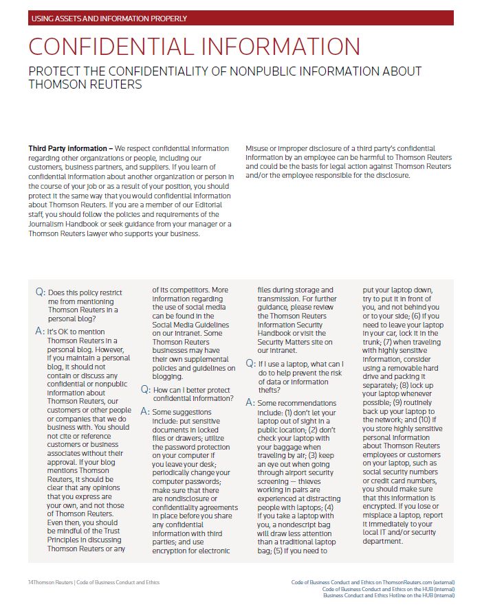 USING ASSETS AND INFORMATION PROPERLY CONFIDENTIAL INFORMATION PROTECT THE CONFIDENTIALITY OF NONPUBLIC INFORMATION ABOUT THOMSON REUTERS Third Party information – We respect confidential information regarding other organizations or people, including our customers, business partners, and suppliers. If you learn of confidential information about another organization or person in the course of your job or as a result of your position, you should protect it the same way that you would confidential information about Thomson Reuters. If you are a member of our Editorial staff, you should follow the policies and requirements of the Journalism Handbook or seek guidance from your manager or a Thomson Reuters lawyer who supports your business. Misuse or improper disclosure of a third party’s confidential information by an employee can be harmful to Thomson Reuters and could be the basis for legal action against Thomson Reuters and/or the employee responsible for the disclosure. Q: Does this policy restrict me from mentioning Thomson Reuters in a personal blog? A: It’s OK to mention Thomson Reuters in a personal blog. However, if you maintain a personal blog, it should not contain or discuss any confidential or nonpublic information about Thomson Reuters, our customers or other people or companies that we do business with. You should not cite or reference customers or business associates without their approval. If your blog mentions Thomson Reuters, it should be clear that any opinions that you express are your own, and not those of Thomson Reuters. Even then, you should be mindful of the Trust Principles in discussing Thomson Reuters or any of its competitors. More information regarding the use of social media can be found in the Social Media Guidelines on our intranet. Some Thomson Reuters businesses may have their own supplemental policies and guidelines on blogging. Q: How can I better protect confidential information? A: Some suggestions include: put sensitive documents in locked files or drawers; utilize the password protection on your computer if you leave your desk; periodically change your computer passwords; make sure that there are nondisclosure or confidentiality agreements in place before you share any confidential information with third parties; and use encryption for electronic files during storage and transmission. For further guidance, please review the Thomson Reuters Information Security Handbook or visit the Security Matters site on our intranet. Q: If I use a laptop, what can I do to help prevent the risk of data or information thefts? A: Some recommendations include: (1) don’t let your laptop out of sight in a public location; (2) don’t check your laptop with your baggage when traveling by air; (3) keep an eye out when going through airport security screening — thieves working in pairs are experienced at distracting people with laptops; (4) if you take a laptop with you, a nondescript bag will draw less attention than a traditional laptop bag; (5) if you need to put your laptop down, try to put it in front of you, and not behind you or to your side; (6) if you need to leave your laptop in your car, lock it in the trunk; (7) when traveling with highly sensitive information, consider using a removable hard drive and packing it separately; (8) lock up your laptop whenever possible; (9) routinely back up your laptop to the network; and (10) if you store highly sensitive personal information about Thomson Reuters employees or customers on your laptop, such as social security numbers or credit card numbers, you should make sure that this information is encrypted. If you lose or misplace a laptop, report it immediately to your local IT and/or security department. Thomson Reuters | Code of Business Conduct and Ethics Code of Business Conduct and Ethics on ThomsonReuters.com (external) Code of Business Conduct and Ethics on the HUB (internal) Business Conduct and Ethics Hotline on the HUB (internal)