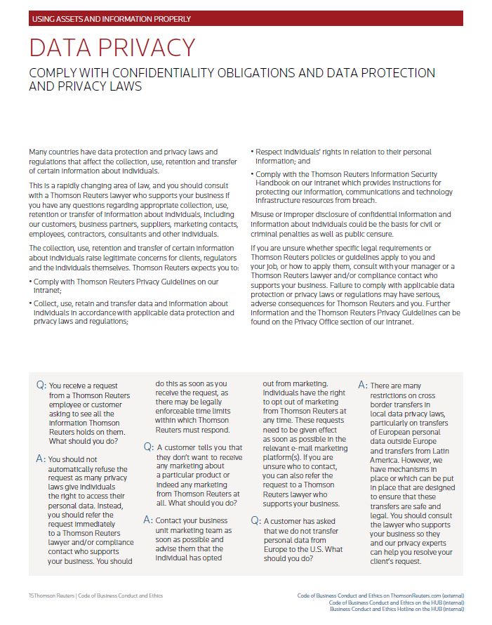 USING ASSETS AND INFORMATION PROPERLY DATA PRIVACY COMPLY WITH CONFIDENTIALITY OBLIGATIONS AND DATA PROTECTION AND PRIVACY LAWS Many countries have data protection and privacy laws and regulations that affect the collection, use, retention and transfer of certain information about individuals. This is a rapidly changing area of law, and you should consult with a Thomson Reuters lawyer who supports your business if you have any questions regarding appropriate collection, use, retention or transfer of information about individuals, including our customers, business partners, suppliers, marketing contacts, employees, contractors, consultants and other individuals. The collection, use, retention and transfer of certain information about individuals raise legitimate concerns for clients, regulators and the individuals themselves. Thomson Reuters expects you to: • Comply with Thomson Reuters Privacy Guidelines on our intranet; • Collect, use, retain and transfer data and information about individuals in accordance with applicable data protection and privacy laws and regulations; • Respect individuals' rights in relation to their personal information; and • Comply with the Thomson Reuters Information Security Handbook on our intranet which provides instructions for protecting our information, communications and technology infrastructure resources from breach. Misuse or improper disclosure of confidential information and information about individuals could be the basis for civil or criminal penalties as well as public censure. If you are unsure whether specific legal requirements or Thomson Reuters policies or guidelines apply to you and your job, or how to apply them, consult with your manager or a Thomson Reuters lawyer and/or compliance contact who supports your business. Failure to comply with applicable data protection or privacy laws or regulations may have serious, adverse consequences for Thomson Reuters and you. Further information and the Thomson Reuters Privacy Guidelines can be found on the Privacy Office section of our intranet. Q: You receive a request from a Thomson Reuters employee or customer asking to see all the information Thomson Reuters holds on them. What should you do? A: You should not automatically refuse the request as many privacy laws give individuals the right to access their personal data. Instead, you should refer the request immediately to a Thomson Reuters lawyer and/or compliance contact who supports your business. You should do this as soon as you receive the request, as there may be legally enforceable time limits within which Thomson Reuters must respond. Q: A customer tells you that they don’t want to receive any marketing about a particular product or indeed any marketing from Thomson Reuters at all. What should you do? A: Contact your business unit marketing team as soon as possible and advise them that the individual has opted out from marketing. Individuals have the right to opt out of marketing from Thomson Reuters at any time. These requests need to be given effect as soon as possible in the relevant e-mail marketing platform(s). If you are unsure who to contact, you can also refer the request to a Thomson Reuters lawyer who supports your business. Q: A customer has asked that we do not transfer personal data from Europe to the U.S. What should you do? A: There are many restrictions on cross border transfers in local data privacy laws, particularly on transfers of European personal data outside Europe and transfers from Latin America. However, we have mechanisms in place or which can be put in place that are designed to ensure that these transfers are safe and legal. You should consult the lawyer who supports your business so they and our privacy experts can help you resolve your client’s request. Thomson Reuters | Code of Business Conduct and Ethics Code of Business Conduct and Ethics on ThomsonReuters.com (external) Code of Business Conduct and Ethics on the HUB (internal) Business Conduct and Ethics Hotline on the HUB (internal)
