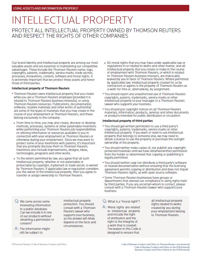 USING ASSETS AND INFORMATION PROPERLY INTELLECTUAL PROPERTY PROTECT ALL INTELLECTUAL PROPERTY OWNED BY THOMSON REUTERS AND RESPECT THE RIGHTS OF OTHER COMPANIES Our brand identity and intellectual property are among our most valuable assets and are essential to maintaining our competitive advantages. These include the Thomson Reuters name, logo, copyrights, patents, trademarks, service marks, trade secrets, processes, innovations, content, software and moral rights. It is extremely important that we protect these assets and honor those of third parties. Intellectual property of Thomson Reuters • Thomson Reuters owns intellectual property that you create while you are a Thomson Reuters employee (provided it is related to Thomson Reuters business interests), or using Thomson Reuters resources. Publications, documentation, software, creative materials and other works of authorship are some of the types of materials that you may create in the course of your employment at Thomson Reuters, and these belong exclusively to the company. » From time to time, you may also create, discover or develop methods, processes, systems or other patentable inventions while performing your Thomson Reuters job responsibilities or utilizing information or resources available to you in connection with your employment at Thomson Reuters or otherwise during your employment. Since we may want to protect some of your inventions with patents, it’s important that you promptly disclose them to Thomson Reuters. Inventions also include improvements, designs, ideas, technologies, programs and other works. » To the extent permitted by law, you agree that all such intellectual property, whether or not patentable or protectable by copyright, trademark or trade secret, is owned by Thomson Reuters. If applicable law or regulation considers you the owner of the intellectual property, then you agree to transfer or assign ownership to Thomson Reuters. » All moral rights that you may have under applicable law or regulations in or related to works and other matter, and all intellectual property that you create or make in the course of employment with Thomson Reuters, or which is related to Thomson Reuters business interests, are irrevocably waived by you in favor of Thomson Reuters. Where permitted by applicable law, intellectual property created for us by contractors or agents is the property of Thomson Reuters as a work-for-hire or, alternatively, by assignment. • You should report any unauthorized use of Thomson Reuters copyrights, patents, trademarks, service marks or other intellectual property to your manager or a Thomson Reuters lawyer who supports your business. • You should put copyright notices on all Thomson Reuters materials, information, products, services and other documents or products intended for public distribution or circulation. Intellectual property of third parties • You should get written permission to use a third party’s copyrights, patents, trademarks, service marks or other intellectual property. If you want or need to use intellectual property that belongs to someone else, we may need to obtain a license to use the property or purchase the outright ownership of the property. • You should neither make copies of, nor publish any copyright- protected materials until we have obtained written permission from the holder or determined that copying or publishing is legally permitted. • You should neither copy nor distribute a third party’s software or related documentation without ensuring that the licensing agreement permits copying or distribution and does not impair Thomson Reuters rights, as with open source software. • Some Thomson Reuters businesses have groups or departments that oversee our compliance in using rights held by third parties. If you are uncertain whom to contact, please consult with a Thomson Reuters lawyer who supports your business. Q: We came across some interesting information in a public database. Can we include it in one of our products without obtaining a permission or consent? A: The information might still be subject to intellectual property protection. You should consult with a Thomson Reuters lawyer who supports your business, as the answer will likely depend on the facts and circumstances. Q: What is a “moral right”? A: Moral rights are related to intellectual property and include the right of attribution and the right to the integrity of a work that is created. The waiver in this Code is designed to ensure that all intellectual property rights related to works created by you during your employment belong to Thomson Reuters. Thomson Reuters | Code of Business Conduct and Ethics Code of Business Conduct and Ethics on ThomsonReuters.com (external) Code of Business Conduct and Ethics on the HUB (internal) Business Conduct and Ethics Hotline on the HUB (internal)