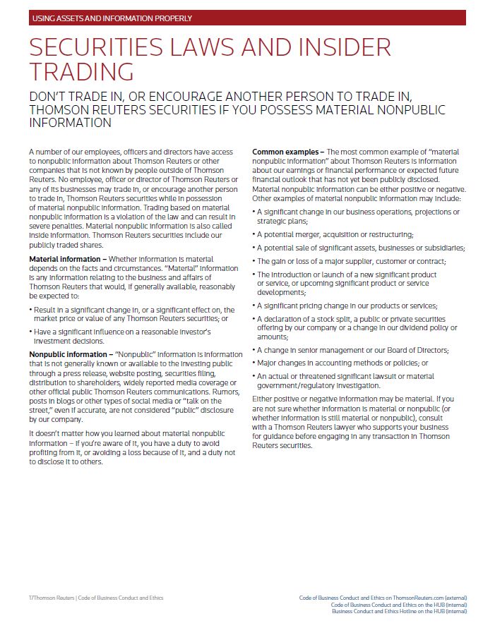 USING ASSETS AND INFORMATION PROPERLY SECURITIES LAWS AND INSIDER TRADING DON’T TRADE IN, OR ENCOURAGE ANOTHER PERSON TO TRADE IN, THOMSON REUTERS SECURITIES IF YOU POSSESS MATERIAL NONPUBLIC INFORMATION A number of our employees, officers and directors have access to nonpublic information about Thomson Reuters or other companies that is not known by people outside of Thomson Reuters. No employee, officer or director of Thomson Reuters or any of its businesses may trade in, or encourage another person to trade in, Thomson Reuters securities while in possession of material nonpublic information. Trading based on material nonpublic information is a violation of the law and can result in severe penalties. Material nonpublic information is also called inside information. Thomson Reuters securities include our publicly traded shares. Material information – Whether information is material depends on the facts and circumstances. “Material” information is any information relating to the business and affairs of Thomson Reuters that would, if generally available, reasonably be expected to: • Result in a significant change in, or a significant effect on, the market price or value of any Thomson Reuters securities; or • Have a significant influence on a reasonable investor’s investment decisions. Nonpublic information – “Nonpublic” information is information that is not generally known or available to the investing public through a press release, website posting, securities filing, distribution to shareholders, widely reported media coverage or other official public Thomson Reuters communications. Rumors, posts in blogs or other types of social media or “talk on the street,” even if accurate, are not considered “public” disclosure by our company. It doesn’t matter how you learned about material nonpublic information – if you’re aware of it, you have a duty to avoid profiting from it, or avoiding a loss because of it, and a duty not to disclose it to others. Common examples – The most common example of “material nonpublic information” about Thomson Reuters is information about our earnings or financial performance or expected future financial outlook that has not yet been publicly disclosed. Material nonpublic information can be either positive or negative. Other examples of material nonpublic information may include: • A significant change in our business operations, projections or strategic plans; • A potential merger, acquisition or restructuring; • A potential sale of significant assets, businesses or subsidiaries; • The gain or loss of a major supplier, customer or contract; • The introduction or launch of a new significant product or service, or upcoming significant product or service developments; • A significant pricing change in our products or services; • A declaration of a stock split, a public or private securities offering by our company or a change in our dividend policy or amounts; • A change in senior management or our Board of Directors; • Major changes in accounting methods or policies; or • An actual or threatened significant lawsuit or material government/regulatory investigation. Either positive or negative information may be material. If you are not sure whether information is material or nonpublic (or whether information is still material or nonpublic), consult with a Thomson Reuters lawyer who supports your business for guidance before engaging in any transaction in Thomson Reuters securities. Thomson Reuters | Code of Business Conduct and Ethics Code of Business Conduct and Ethics on ThomsonReuters.com (external) Code of Business Conduct and Ethics on the HUB (internal) Business Conduct and Ethics Hotline on the HUB (internal)