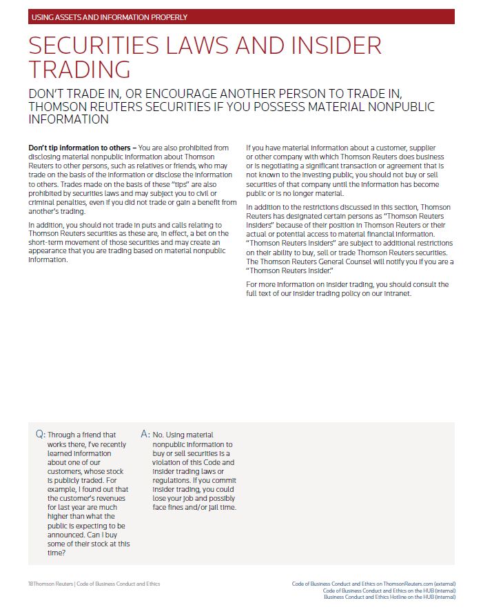 USING ASSETS AND INFORMATION PROPERLY SECURITIES LAWS AND INSIDER TRADING DON’T TRADE IN, OR ENCOURAGE ANOTHER PERSON TO TRADE IN, THOMSON REUTERS SECURITIES IF YOU POSSESS MATERIAL NONPUBLIC INFORMATION Don’t tip information to others – You are also prohibited from disclosing material nonpublic information about Thomson Reuters to other persons, such as relatives or friends, who may trade on the basis of the information or disclose the information to others. Trades made on the basis of these “tips” are also prohibited by securities laws and may subject you to civil or criminal penalties, even if you did not trade or gain a benefit from another’s trading. In addition, you should not trade in puts and calls relating to Thomson Reuters securities as these are, in effect, a bet on the short-term movement of those securities and may create an appearance that you are trading based on material nonpublic information. If you have material information about a customer, supplier or other company with which Thomson Reuters does business or is negotiating a significant transaction or agreement that is not known to the investing public, you should not buy or sell securities of that company until the information has become public or is no longer material. In addition to the restrictions discussed in this section, Thomson Reuters has designated certain persons as “Thomson Reuters Insiders” because of their position in Thomson Reuters or their actual or potential access to material financial information. “Thomson Reuters Insiders” are subject to additional restrictions on their ability to buy, sell or trade Thomson Reuters securities. The Thomson Reuters General Counsel will notify you if you are a “Thomson Reuters Insider.” For more information on insider trading, you should consult the full text of our insider trading policy on our intranet. Q: Through a friend that works there, I’ve recently learned information about one of our customers, whose stock is publicly traded. For example, I found out that the customer’s revenues for last year are much higher than what the public is expecting to be announced. Can I buy some of their stock at this time? A: No. Using material nonpublic information to buy or sell securities is a violation of this Code and insider trading laws or regulations. If you commit insider trading, you could lose your job and possibly face fines and/or jail time. Thomson Reuters | Code of Business Conduct and Ethics Code of Business Conduct and Ethics on ThomsonReuters.com (external) Code of Business Conduct and Ethics on the HUB (internal) Business Conduct and Ethics Hotline on the HUB (internal)
