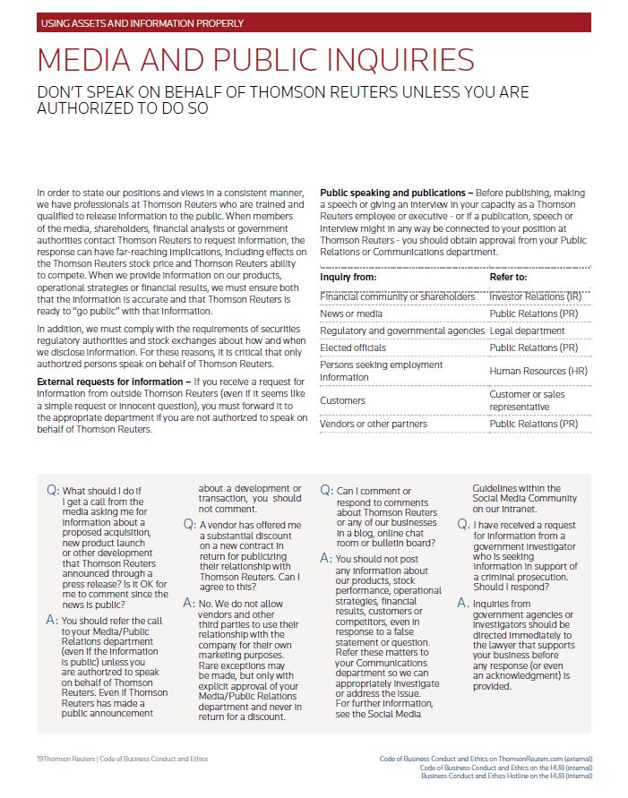 USING ASSETS AND INFORMATION PROPERLY MEDIA AND PUBLIC INQUIRIES DON’T SPEAK ON BEHALF OF THOMSON REUTERS UNLESS YOU ARE AUTHORIZED TO DO SO In order to state our positions and views in a consistent manner, we have professionals at Thomson Reuters who are trained and qualified to release information to the public. When members of the media, shareholders, financial analysts or government authorities contact Thomson Reuters to request information, the response can have far-reaching implications, including effects on the Thomson Reuters stock price and Thomson Reuters ability to compete. When we provide information on our products, operational strategies or financial results, we must ensure both that the information is accurate and that Thomson Reuters is ready to “go public” with that information. In addition, we must comply with the requirements of securities regulatory authorities and stock exchanges about how and when we disclose information. For these reasons, it is critical that only authorized persons speak on behalf of Thomson Reuters. External requests for information – If you receive a request for information from outside Thomson Reuters (even if it seems like a simple request or innocent question), you must forward it to the appropriate department if you are not authorized to speak on behalf of Thomson Reuters. Public speaking and publications – Before publishing, making a speech or giving an interview in your capacity as a Thomson Reuters employee or executive - or if a publication, speech or interview might in any way be connected to your position at Thomson Reuters - you should obtain approval from your Public Relations or Communications department. Inquiry from: Refer to: Financial community or shareholders Investor Relations (IR) News or media Public Relations (PR) Regulatory and governmental agencies Legal department Elected officials Public Relations (PR) Persons seeking employment information Human Resources (HR) Customers Customer or sales representative Vendors or other partners Public Relations (PR) Q: What should I do if I get a call from the media asking me for information about a proposed acquisition, new product launch or other development that Thomson Reuters announced through a press release? Is it OK for me to comment since the news is public? A: You should refer the call to your Media/Public Relations department (even if the information is public) unless you are authorized to speak on behalf of Thomson Reuters. Even if Thomson Reuters has made a public announcement about a development or transaction, you should not comment. Q: A vendor has offered me a substantial discount on a new contract in return for publicizing their relationship with Thomson Reuters. Can I agree to this? A: No. We do not allow vendors and other third parties to use their relationship with the company for their own marketing purposes. Rare exceptions may be made, but only with explicit approval of your Media/Public Relations department and never in return for a discount. Q: Can I comment or respond to comments about Thomson Reuters or any of our businesses in a blog, online chat room or bulletin board? A: You should not post any information about our products, stock performance, operational strategies, financial results, customers or competitors, even in response to a false statement or question. Refer these matters to your Communications department so we can appropriately investigate or address the issue. For further information, see the Social Media Guidelines within the Social Media Community on our intranet. Q. I have received a request for information from a government investigator who is seeking information in support of a criminal prosecution. Should I respond? A. Inquiries from government agencies or investigators should be directed immediately to the lawyer that supports your business before any response (or even an acknowledgment) is provided. Thomson Reuters | Code of Business Conduct and Ethics Code of Business Conduct and hics on ThomsonReuters.com (external) Code of Business Conduct and Ethics on the HUB (internal) Business Conduct and Ethics Hotline on the HUB (internal)