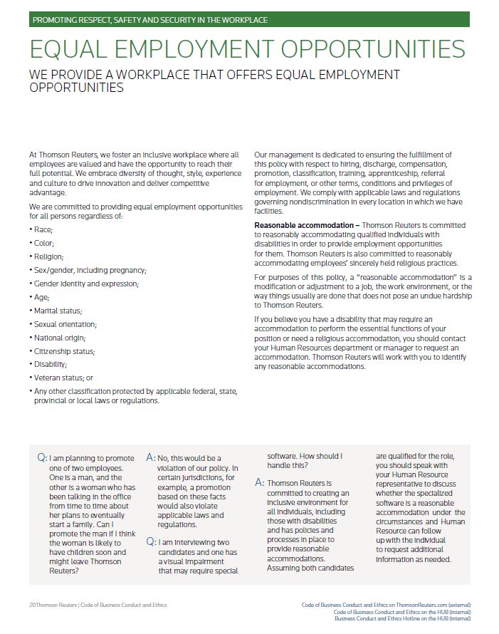 PROMOTING RESPECT, SAFETY AND SECURITY IN THE WORKPLACE EQUAL EMPLOYMENT OPPORTUNITIES WE PROVIDE A WORKPLACE THAT OFFERS EQUAL EMPLOYMENT OPPORTUNITIES At Thomson Reuters, we foster an inclusive workplace where all employees are valued and have the opportunity to reach their full potential. We embrace diversity of thought, style, experience and culture to drive innovation and deliver competitive advantage. We are committed to providing equal employment opportunities for all persons regardless of: • Race; • Color; • Religion; • Sex/gender, including pregnancy; • Gender identity and expression; • Age; • Marital status; • Sexual orientation; • National origin; • Citizenship status; • Disability; • Veteran status; or • Any other classification protected by applicable federal, state, provincial or local laws or regulations. Our management is dedicated to ensuring the fulfillment of this policy with respect to hiring, discharge, compensation, promotion, classification, training, apprenticeship, referral for employment, or other terms, conditions and privileges of employment. We comply with applicable laws and regulations governing nondiscrimination in every location in which we have facilities. Reasonable accommodation – Thomson Reuters is committed to reasonably accommodating qualified individuals with disabilities in order to provide employment opportunities for them. Thomson Reuters is also committed to reasonably accommodating employees’ sincerely held religious practices. For purposes of this policy, a “reasonable accommodation” is a modification or adjustment to a job, the work environment, or the way things usually are done that does not pose an undue hardship to Thomson Reuters. If you believe you have a disability that may require an accommodation to perform the essential functions of your position or need a religious accommodation, you should contact your Human Resources department or manager to request an accommodation. Thomson Reuters will work with you to identify any reasonable accommodations. Q: I am planning to promote one of two employees. One is a man, and the other is a woman who has been talking in the office from time to time about her plans to eventually start a family. Can I promote the man if I think the woman is likely to have children soon and might leave Thomson Reuters? A: No, this would be a violation of our policy. In certain jurisdictions, for example, a promotion based on these facts would also violate applicable laws and regulations. Q: I am interviewing two candidates and one has a visual impairment that may require special software. How should I handle this? A: Thomson Reuters is committed to creating an inclusive environment for all individuals, including those with disabilities and has policies and processes in place to provide reasonable accommodations. Assuming both candidates are qualified for the role, you should speak with your Human Resource representative to discuss whether the specialized software is a reasonable accommodation under the circumstances and Human Resource can follow up with the individual to request additional information as needed. Thomson Reuters | Code of Business Conduct and Ethics Code of Business Conduct and Ethics on ThomsonReuters.com (external) Code of Business Conduct and Ethics on the HUB (internal) Business Conduct and Ethics Hotline on the HUB (internal)