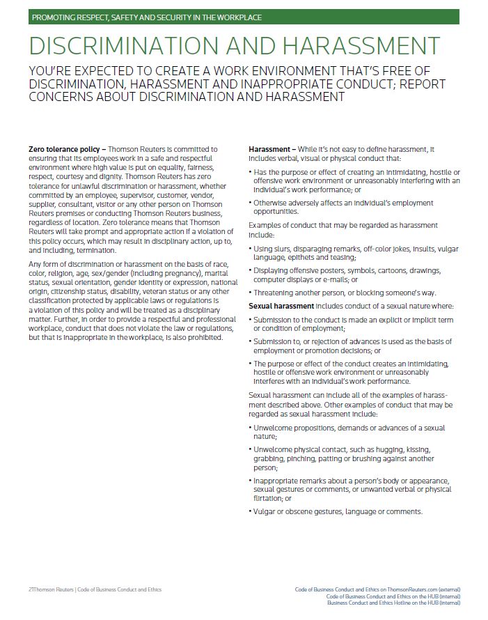 PROMOTING RESPECT, SAFETY AND SECURITY IN THE WORKPLACE DISCRIMINATION AND HARASSMENT YOU’RE EXPECTED TO CREATE A WORK ENVIRONMENT THAT’S FREE OF ISCRIMINATION, HARASSMENT AND INAPPROPRIATE CONDUCT; REPORT CONCERNS ABOUT ISCRIMINATION AND HARASSMENT Zero tolerance policy – Thomson Reuters is committed to ensuring that its employees work in a safe and respectful environment where high value is put on equality, fairness, respect, courtesy and dignity. Thomson Reuters has zero tolerance for unlawful discrimination or harassment, whether committed by an employee, supervisor, customer, vendor, supplier, consultant, visitor or any other person on Thomson Reuters premises or conducting Thomson Reuters business, regardless of location. Zero tolerance means that Thomson Reuters will take prompt and appropriate action if a violation of this policy occurs, which may result in disciplinary action, up to, and including, termination. Any form of discrimination or harassment on the basis of race, color, religion, age, sex/gender (including pregnancy), marital status, sexual orientation, gender identity or expression, national origin, citizenship status, disability, veteran status or any other classification protected by applicable laws or regulations is a violation of this policy and will be treated as a disciplinary matter. Further, in order to provide a respectful and professional workplace, conduct that does not violate the law or regulations, but that is inappropriate in the workplace, is also prohibited. Harassment – While it’s not easy to define harassment, it includes verbal, visual or physical conduct that: • Has the purpose or effect of creating an intimidating, hostile or offensive work environment or unreasonably interfering with an individual’s work performance; or • Otherwise adversely affects an individual’s employment opportunities. Examples of conduct that may be regarded as harassment include: • Using slurs, disparaging remarks, off-color jokes, insults, vulgar language, epithets and teasing; • Displaying offensive posters, symbols, cartoons, drawings, computer displays or e-mails; or • Threatening another person, or blocking someone’s way. Sexual harassment includes conduct of a sexual nature where: • Submission to the conduct is made an explicit or implicit term or condition of employment; • Submission to, or rejection of advances is used as the basis of employment or promotion decisions; or • The purpose or effect of the conduct creates an intimidating, hostile or offensive work environment or unreasonably interferes with an individual’s work performance. Sexual harassment can include all of the examples of harass- ment described above. Other examples of conduct that may be regarded as sexual harassment include: • Unwelcome propositions, demands or advances of a sexual nature; • Unwelcome physical contact, such as hugging, kissing, grabbing, pinching, patting or brushing against another person; • Inappropriate remarks about a person’s body or appearance, sexual gestures or comments, or unwanted verbal or physical flirtation; or • Vulgar or obscene gestures, language or comments. Thomson Reuters | Code of Business Conduct and Ethics Code of Business Conduct and Ethics on ThomsonReuters.com (external) Code of Business Conduct and Ethics on the HUB (internal) Business Conduct and Ethics Hotline on the HUB (internal)