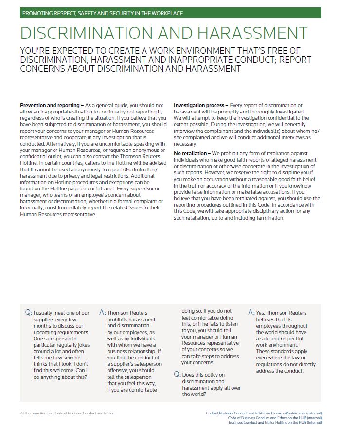 PROMOTING RESPECT, SAFETY AND SECURITY IN THE WORKPLACE DISCRIMINATION AND HARASSMENT YOU’RE EXPECTED TO CREATE A WORK ENVIRONMENT THAT’S FREE OF DISCRIMINATION, HARASSMENT AND INAPPROPRIATE CONDUCT; REPORT CONCERNS ABOUT DISCRIMINATION AND HARASSMENT Prevention and reporting – As a general guide, you should not allow an inappropriate situation to continue by not reporting it, regardless of who is creating the situation. If you believe that you have been subjected to discrimination or harassment, you should report your concerns to your manager or Human Resources representative and cooperate in any investigation that is conducted. Alternatively, if you are uncomfortable speaking with your manager or Human Resources, or require an anonymous or confidential outlet, you can also contact the Thomson Reuters Hotline. In certain countries, callers to the Hotline will be advised that it cannot be used anonymously to report discrimination/ harassment due to privacy and legal restrictions. Additional information on Hotline procedures and exceptions can be found on the Hotline page on our intranet. Every supervisor or manager, who learns of an employee’s concern about harassment or discrimination, whether in a formal complaint or informally, must immediately report the related issues to their Human Resources representative. Investigation process – Every report of discrimination or harassment will be promptly and thoroughly investigated. We will attempt to keep the investigation confidential to the extent possible. During the investigation, we will generally interview the complainant and the individual(s) about whom he/ she complained and we will conduct additional interviews as necessary. No retaliation – We prohibit any form of retaliation against individuals who make good faith reports of alleged harassment or discrimination or otherwise cooperate in the investigation of such reports. However, we reserve the right to discipline you if you make an accusation without a reasonable good faith belief in the truth or accuracy of the information or if you knowingly provide false information or make false accusations. If you believe that you have been retaliated against, you should use the reporting procedures outlined in this Code. In accordance with this Code, we will take appropriate disciplinary action for any such retaliation, up to and including termination. Q: I usually meet one of our suppliers every few months to discuss our upcoming requirements. One salesperson in particular regularly jokes around a lot and often tells me how sexy he thinks that I look. I don’t find this welcome. Can I do anything about this? A: Thomson Reuters prohibits harassment and discrimination by our employees, as well as by individuals with whom we have a business relationship. If you find the conduct of a supplier’s salesperson offensive, you should tell the salesperson that you feel this way, if you are comfortable doing so. If you do not feel comfortable doing this, or if he fails to listen to you, you should tell your manager or Human Resources representative of your concerns so we can take steps to address your concerns. Q: Does this policy on discrimination and harassment apply all over the world? A: Yes. Thomson Reuters believes that its employees throughout the world should have a safe and respectful work environment. These standards apply even where the law or regulations do not directly address the conduct. Thomson Reuters | Code of Business Conduct and Ethics Code of Business Conduct and Ethics on ThomsonReuters.com (external) Code of Business Conduct and Ethics on the HUB (internal) Business Conduct and Ethics Hotline on the HUB (internal)