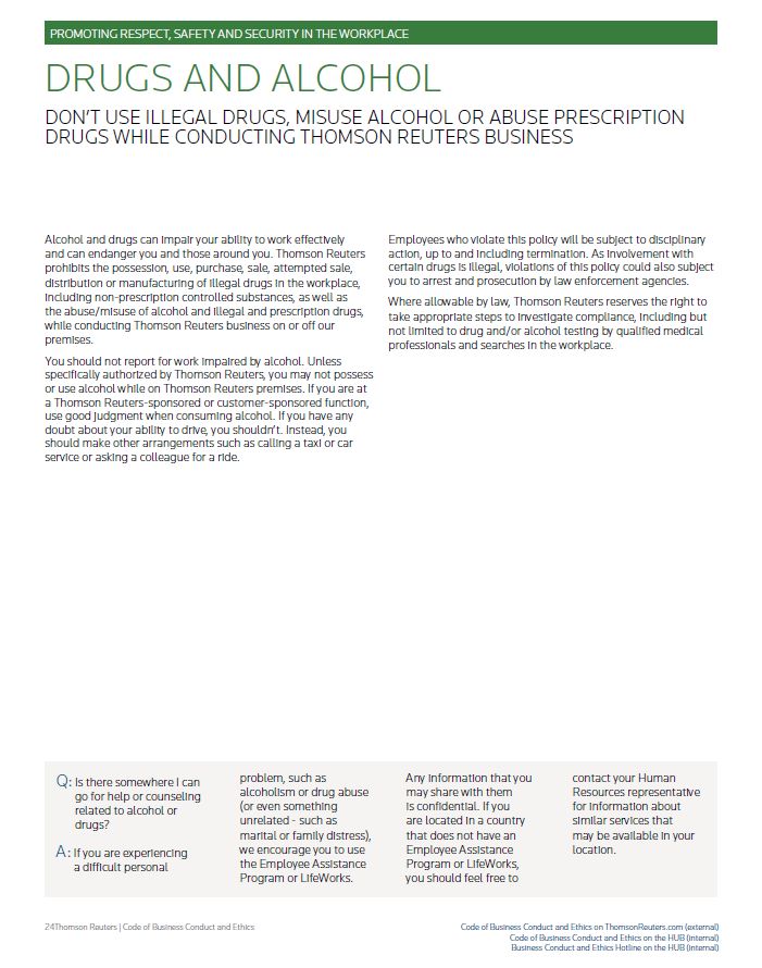 PROMOTING RESPECT, SAFETY AND SECURITY IN THE WORKPLACE DRUGS AND ALCOHOL DON’T USE ILLEGAL DRUGS, MISUSE ALCOHOL OR ABUSE PRESCRIPTION DRUGS WHILE CONDUCTING THOMSON REUTERS BUSINESS Alcohol and drugs can impair your ability to work effectively and can endanger you and those around you. Thomson Reuters prohibits the possession, use, purchase, sale, attempted sale, distribution or manufacturing of illegal drugs in the workplace, including non-prescription controlled substances, as well as the abuse/misuse of alcohol and illegal and prescription drugs, while conducting Thomson Reuters business on or off our premises. You should not report for work impaired by alcohol. Unless specifically authorized by Thomson Reuters, you may not possess or use alcohol while on Thomson Reuters premises. If you are at a Thomson Reuters-sponsored or customer-sponsored function, use good judgment when consuming alcohol. If you have any doubt about your ability to drive, you shouldn’t. Instead, you should make other arrangements such as calling a taxi or car service or asking a colleague for a ride. Employees who violate this policy will be subject to disciplinary action, up to and including termination. As involvement with certain drugs is illegal, violations of this policy could also subject you to arrest and prosecution by law enforcement agencies. Where allowable by law, Thomson Reuters reserves the right to take appropriate steps to investigate compliance, including but not limited to drug and/or alcohol testing by qualified medical professionals and searches in the workplace. Q: Is there somewhere I can go for help or counseling related to alcohol or drugs? A: If you are experiencing a difficult personal problem, such as alcoholism or drug abuse (or even something unrelated - such as marital or family distress), we encourage you to use the Employee Assistance Program or LifeWorks. Any information that you may share with them is confidential. If you are located in a country that does not have an Employee Assistance Program or LifeWorks, you should feel free to contact your Human Resources representative for information about similar services that may be available in your location. Thomson Reuters | Code of Business Conduct and Ethics Code of Business Conduct and Ethics on ThomsonReuters.com (external) Code of Business Conduct and Ethics on the HUB (internal) Business Conduct and Ethics Hotline on the HUB (internal)