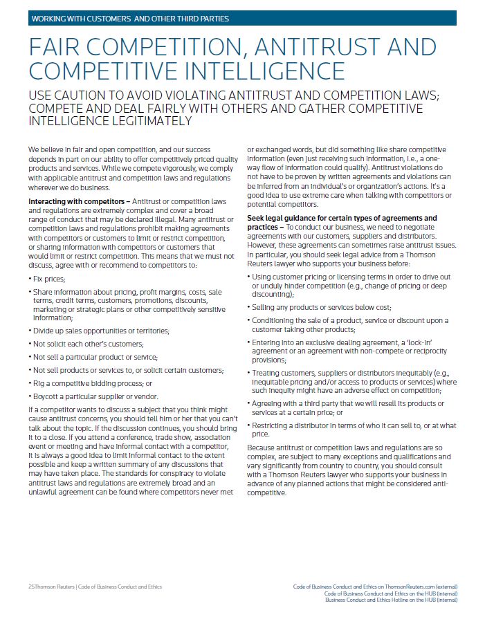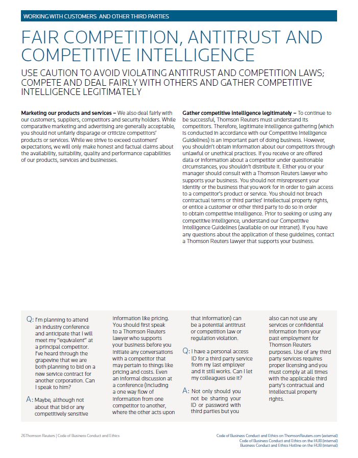 WORKING WITH CUSTOMERS AND OTHER THIRD PARTIES FAIR COMPETITION, ANTITRUST AND COMPETITIVE INTELLIGENCE USE CAUTION TO AVOID VIOLATING ANTITRUST AND COMPETITION LAWS; COMPETE AND DEAL FAIRLY WITH OTHERS AND GATHER COMPETITIVE INTELLIGENCE LEGITIMATELY Marketing our products and services – We also deal fairly with our customers, suppliers, competitors and security holders. While comparative marketing and advertising are generally acceptable, you should not unfairly disparage or criticize competitors’ products or services. While we strive to exceed customers’ expectations, we will only make honest and factual claims about the availability, suitability, quality and performance capabilities of our products, services and businesses. Gather competitive intelligence legitimately – To continue to be successful, Thomson Reuters must understand its competitors. Therefore, legitimate intelligence gathering (which is conducted in accordance with our Competitive Intelligence Guidelines) is an important part of doing business. However, you shouldn’t obtain information about our competitors through unlawful or unethical practices. If you receive or are offered data or information about a competitor under questionable circumstances, you shouldn’t distribute it. Either you or your manager should consult with a Thomson Reuters lawyer who supports your business. You should not misrepresent your identity or the business that you work for in order to gain access to a competitor’s product or service. You should not breach contractual terms or third parties’ intellectual property rights, or entice a customer or other third party to do so in order to obtain competitive intelligence. Prior to seeking or using any competitive intelligence, understand our Competitive Intelligence Guidelines (available on our intranet). If you have any questions about the application of these guidelines, contact a Thomson Reuters lawyer that supports your business. Q: I’m planning to attend an industry conference and anticipate that I will meet my “equivalent” at a principal competitor. I’ve heard through the grapevine that we are both planning to bid on a new service contract for another corporation. Can I speak to him? A: Maybe, although not about that bid or any competitively sensitive information like pricing. You should first speak to a Thomson Reuters lawyer who supports your business before you initiate any conversations with a competitor that may pertain to things like pricing and costs. Evenan informal discussion at a conference (including a one way flow of information from one competitor to another, where the other acts upon that information) can be a potential antitrust or competition law or regulation violation.Q: I have a personal access ID for a third party service from my last employer and it still works. Can I let my colleagues use it? A: Not only should you not be sharing your ID or password with third parties but you also can not use any services or confidential information from your past employment for Thomson Reuters purposes. Use of any third party services requires proper licensing and you must comply at all times with the applicable third party’s contractual and intellectual property rights. Thomson Reuters | Code of Business Conduct and Ethics Code of Business Conduct and Ethics on ThomsonReuters.com (external) Code of Business Conduct and Ethics on the HUB (internal) Business Conduct and Ethics Hotline on the HUB (internal)