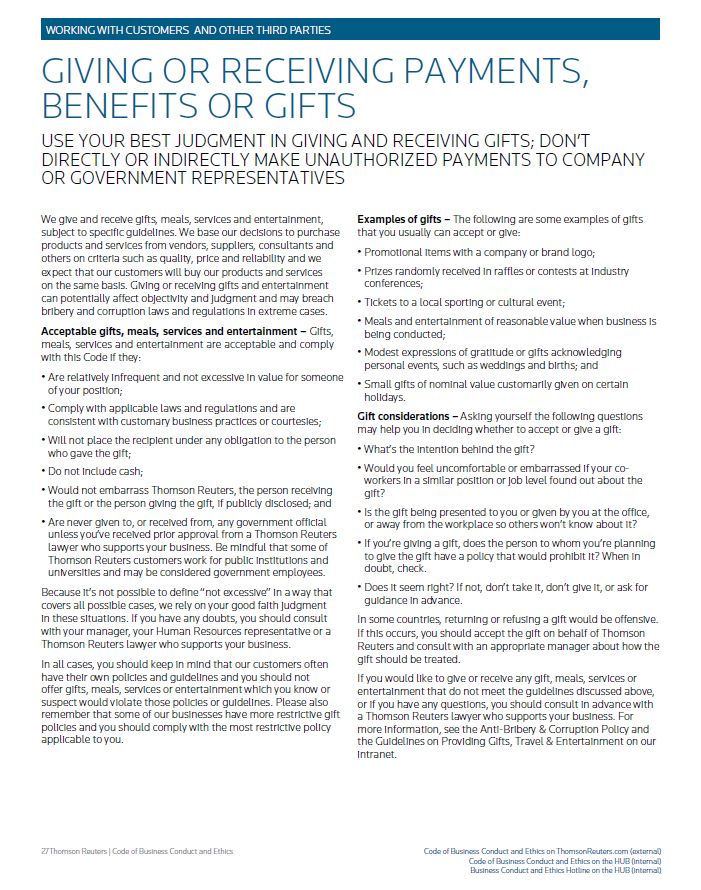 GIVING OR RECEIVING PAYMENTS, BENEFITS OR GIFTS USE YOUR BEST JUDGMENT IN GIVING AND RECEIVING GIFTS; DON’T DIRECTLY OR INDIRECTLY MAKE UNAUTHORIZED PAYMENTS TO COMPANY OR GOVERNMENT REPRESENTATIVES We give and receive gifts, meals, services and entertainment, subject to specific guidelines. We base our decisions to purchase products and services from vendors, suppliers, consultants and others on criteria such as quality, price and reliability and we expect that our customers will buy our products and services on the same basis. Giving or receiving gifts and entertainment can potentially affect objectivity and judgment and may breach bribery and corruption laws and regulations in extreme cases. Acceptable gifts, meals, services and entertainment – Gifts, meals, services and entertainment are acceptable and comply with this Code if they: • Are relatively infrequent and not excessive in value for someone of your position; • Comply with applicable laws and regulations and are consistent with customary business practices or courtesies; • Will not place the recipient under any obligation to the person who gave the gift; • Do not include cash; • Would not embarrass Thomson Reuters, the person receiving the gift or the person giving the gift, if publicly disclosed; and • Are never given to, or received from, any government official unless you’ve received prior approval from a Thomson Reuters lawyer who supports your business. Be mindful that some of Thomson Reuters customers work for public institutions and universities and may be considered government employees. Because it’s not possible to define “not excessive” in a way that covers all possible cases, we rely on your good faith judgment in these situations. If you have any doubts, you should consult with your manager, your Human Resources representative or a Thomson Reuters lawyer who supports your business. In all cases, you should keep in mind that our customers often have their own policies and guidelines and you should not offer gifts, meals, services or entertainment which you know or suspect would violate those policies or guidelines. Please also remember that some of our businesses have more restrictive gift policies and you should comply with the most restrictive policy applicable to you. Examples of gifts – The following are some examples of gifts that you usually can accept or give: • Promotional items with a company or brand logo; • Prizes randomly received in raffles or contests at industry conferences; • Tickets to a local sporting or cultural event; • Meals and entertainment of reasonable value when business is being conducted; • Modest expressions of gratitude or gifts acknowledging personal events, such as weddings and births; and • Small gifts of nominal value customarily given on certain holidays. Gift considerations – Asking yourself the following questions may help you in deciding whether to accept or give a gift: • What’s the intention behind the gift? • Would you feel uncomfortable or embarrassed if your co- workers in a similar position or job level found out about the gift? • Is the gift being presented to you or given by you at the office, or away from the workplace so others won’t know about it? • If you’re giving a gift, does the person to whom you’re planning to give the gift have a policy that would prohibit it? When in doubt, check. • Does it seem right? If not, don’t take it, don’t give it, or ask for guidance in advance. In some countries, returning or refusing a gift would be offensive. If this occurs, you should accept the gift on behalf of Thomson Reuters and consult with an appropriate manager about how the gift should be treated. If you would like to give or receive any gift, meals, services or entertainment that do not meet the guidelines discussed above, or if you have any questions, you should consult in advance with a Thomson Reuters lawyer who supports your business. For more information, see the Anti-Bribery & Corruption Policy and the Guidelines on Providing Gifts, Travel & Entertainment on our intranet. Thomson Reuters | Code of Business Conduct and Ethics Code of Business Conduct and Ethics on ThomsonReuters.com (external) Code of Business Conduct and Ethics on the HUB (internal) Business Conduct and Ethics Hotline on the HUB (internal)