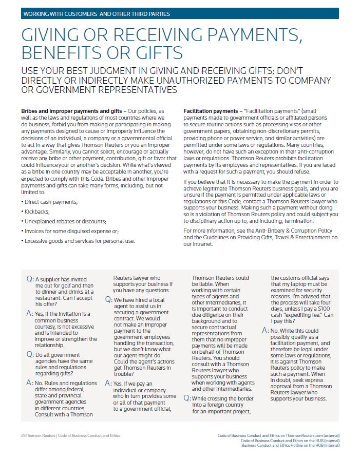 WORKING WITH CUSTOMERS AND OTHER THIRD PARTIES GIVING OR RECEIVING PAYMENTS, BENEFITS OR GIFTS USE YOUR BEST JUDGMENT IN GIVING AND RECEIVING GIFTS; DON’T DIRECTLY OR INDIRECTLY MAKE UNAUTHORIZED PAYMENTS TO COMPANY OR GOVERNMENT REPRESENTATIVES Bribes and improper payments and gifts – Our policies, as well as the laws and regulations of most countries where we do business, forbid you from making or participating in making any payments designed to cause or improperly influence the decisions of an individual, a company or a governmental official to act in a way that gives Thomson Reuters or you an improper advantage. Similarly, you cannot solicit, encourage or actually receive any bribe or other payment, contribution, gift or favor that could influence your or another’s decision. While what’s viewed as a bribe in one country may be acceptable in another, you’re expected to comply with this Code. Bribes and other improper payments and gifts can take many forms, including, but not limited to: • Direct cash payments; • Kickbacks; • Unexplained rebates or discounts; • Invoices for some disguised expense or; • Excessive goods and services for personal use. Facilitation payments – “Facilitation payments” (small payments made to government officials or affiliated persons to secure routine actions such as processing visas or other government papers, obtaining non-discretionary permits, providing phone or power service, and similar activities) are permitted under some laws or regulations. Many countries, however, do not have such an exception in their anti-corruption laws or regulations. Thomson Reuters prohibits facilitation payments by its employees and representatives. If you are faced with a request for such a payment, you should refuse. If you believe that it is necessary to make the payment in order to achieve legitimate Thomson Reuters business goals, and you are unsure if the payment is permitted under applicable laws or regulations or this Code, contact a Thomson Reuters lawyer who supports your business. Making such a payment without doing so is a violation of Thomson Reuters policy and could subject you to disciplinary action up to, and including, termination. For more information, see the Anti-Bribery & Corruption Policy and the Guidelines on Providing Gifts, Travel & Entertainment on our intranet. Q: A supplier has invited me out for golf and then to dinner and drinks at a restaurant. Can I accept his offer? A: Yes, if the invitation is a common business courtesy, is not excessive and is intended to improve or strengthen the relationship. Q: Do all government agencies have the same rules and regulations regarding gifts? A: No. Rules and regulations differ among federal, state and provincial government agencies in different countries. Consult with a Thomson Reuters lawyer who supports your business if you have any questions Q: We have hired a local agent to assist us in securing a government contract. We would not make an improper payment to the government employees handling the transaction, but we don’t know what our agent might do. Could the agent’s actions get Thomson Reuters in trouble? A: Yes. If we pay an individual or company who in turn provides some or all of that payment to a government official, Thomson Reuters could be liable. When working with certain types of agents and other intermediaries, it is important to conduct due diligence on their background and to secure contractual representations from them that no improper payments will be made on behalf of Thomson Reuters. You should consult with a Thomson Reuters lawyer who supports your business when working with agents and other intermediaries. Q: While crossing the border into a foreign country for an important project, the customs official says that my laptop must be examined for security reasons. I’m advised that the process will take four days, unless I pay a $100 cash “expediting fee.” Can I pay this? A: No. While this could possibly qualify as a facilitation payment, and therefore be legal under some laws or regulations, it is against Thomson Reuters policy to make such a payment. When in doubt, seek express approval from a Thomson Reuters lawyer who supports your business. Thomson Reuters | Code of Business Conduct and Ethics Code of Business Conduct and Ethics on ThomsonReuters.com (external) Code of Business Conduct and Ethics on the HUB (internal) Business Conduct and Ethics Hotline on the HUB (internal)