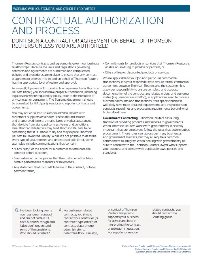 WORKING WITH CUSTOMERS AND OTHER THIRD PARTIES CONTRACTUAL AUTHORIZATION AND PROCESS DON’T SIGN A CONTRACT OR AGREEMENT ON BEHALF OF THOMSON Thomson Reuters contracts and agreements govern our business relationships. Because the laws and regulations governing contracts and agreements are numerous and complicated, policies and procedures are in place to ensure that any contract or agreement entered into by and on behalf of Thomson Reuters has the appropriate level of review and approval. As a result, if you enter into contracts or agreements on Thomson Reuters behalf, you should have proper authorization, including legal review where required by policy, prior to the execution of any contract or agreement. The Sourcing department should be consulted for third party vendor and supplier contracts and agreements. You may not enter into unauthorized “side letters” with customers, suppliers or vendors. These are undisclosed and unapproved letters, e-mails, faxes or verbal assurances that deviate from standard contract terms and conditions. Unauthorized side letters may bind Thomson Reuters to do something that it is unable to do, and may expose Thomson Reuters to unwanted liability. While it’s not possible to describe every type of unauthorized and undisclosed side letter, some examples include communications that contain: • “Early outs,” or the ability for a customer to terminate the contract before it expires; • Guarantees or contingencies that the customer will achieve certain performance measures or milestones; • Any statement that contradicts terms in the contract, notably payment terms; • Commitments for products or services that Thomson Reuters is unable or unwilling to provide or perform; or • Offers of free or discounted products or services. Where applicable to your job and particular commercial transactions, it is your responsibility to ensure formal contractual agreement between Thomson Reuters and the customer. It is also your responsibility to ensure complete and accurate documentation of the contract, any related orders, and customer status (e.g., new versus existing), in applications used to process customer accounts and transactions. Your specific business will likely have more detailed requirements and instructions on contracts recordings and processing requirements beyond what is described here. Government Contracting - Thomson Reuters has a long tradition of providing products and services to governments. When Thomson Reuters works with governments, it is vitally important that our employees follow the rules that govern public procurement. Those rules vary across our many businesses and government markets, but they all require a common commitment to integrity. When dealing with governments, be sure to consult with the Thomson Reuters lawyer who supports your business and comply with applicable laws, policies and standards. Thomson Reuters | Code of Business Conduct and Ethics Code of Business Conduct and Ethics on ThomsonReuters.com (external) Code of Business Conduct and Ethics on the HUB (internal) Business Conduct and Ethics Hotline on the HUB (internal) Q: I’ve been looking over a new customer contract and I’m not certain if I have authority to sign and I also don’t understand some of the provisions. Who should I contact? A: For customer-related contracts, you should contact your controller (or controller-type officer) or contracts department/ administrator to determine if you can sign, or contact a Thomson Reuters lawyer who supports your business for advice and help in interpreting the contract or provision in question. For supplier or vendor- related contracts, you should contact the