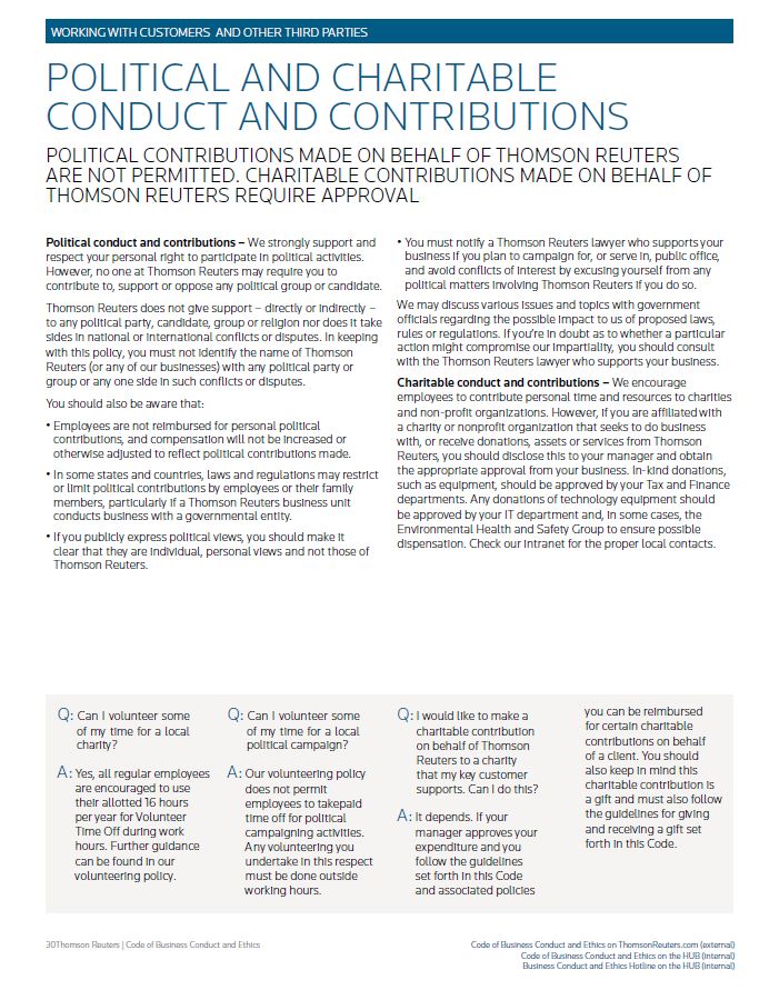 WORKING WITH CUSTOMERS AND OTHER THIRD PARTIES POLITICAL AND CHARITABLE CONDUCT AND CONTRIBUTIONS POLITICAL CONTRIBUTIONS MADE ON BEHALF OF THOMSON REUTERS ARE NOT PERMITTED. CHARITABLE CONTRIBUTIONS MADE ON BEHALF OF THOMSON REUTERS REQUIRE APPROVAL Political conduct and contributions – We strongly support and respect your personal right to participate in political activities. However, no one at Thomson Reuters may require you to contribute to, support or oppose any political group or candidate. Thomson Reuters does not give support – directly or indirectly – to any political party, candidate, group or religion nor does it take sides in national or international conflicts or disputes. In keeping with this policy, you must not identify the name of Thomson Reuters (or any of our businesses) with any political party or group or any one side in such conflicts or disputes. You should also be aware that: • Employees are not reimbursed for personal political contributions, and compensation will not be increased or otherwise adjusted to reflect political contributions made. • In some states and countries, laws and regulations may restrict or limit political contributions by employees or their family members, particularly if a Thomson Reuters business unit conducts business with a governmental entity. • If you publicly express political views, you should make it clear that they are individual, personal views and not those of Thomson Reuters. • You must notify a Thomson Reuters lawyer who supports your business if you plan to campaign for, or serve in, public office, and avoid conflicts of interest by excusing yourself from any political matters involving Thomson Reuters if you do so. We may discuss various issues and topics with government officials regarding the possible impact to us of proposed laws, rules or regulations. If you’re in doubt as to whether a particular action might compromise our impartiality, you should consult with the Thomson Reuters lawyer who supports your business. Charitable conduct and contributions – We encourage employees to contribute personal time and resources to charities and non-profit organizations. However, if you are affiliated with a charity or nonprofit organization that seeks to do business with, or receive donations, assets or services from Thomson Reuters, you should disclose this to your manager and obtain the appropriate approval from your business. In-kind donations, such as equipment, should be approved by your Tax and Finance departments. Any donations of technology equipment should be approved by your IT department and, in some cases, the Environmental Health and Safety Group to ensure possible dispensation. Check our intranet for the proper local contacts. 30Thomson Reuters | Code of Business Conduct and Ethics Code of Business Conduct and Ethics on ThomsonReuters.com (external) Code of Business Conduct and Ethics on the HUB (internal) Business Conduct and Ethics Hotline on the HUB (internal) Q: Can I volunteer some of my time for a local charity? A: Yes, all regular employees are encouraged to use their allotted 16 hours per year for Volunteer Time Off during work hours. Further guidance can be found in our volunteering policy. Q: Can I volunteer some of my time for a local political campaign? A: Our volunteering policy does not permit employees to takepaid time off for political campaigning activities. Any volunteering you undertake in this respect must be done outside working hours. Q: I would like to make a charitable contribution on behalf of Thomson Reuters to a charity that my key customer supports. Can I do this? A: It depends. If your manager approves your expenditure and you follow the guidelines set forth in this Code and associated policies you can be reimbursed for certain charitable contributions on behalf of a client. You should also keep in mind this charitable contribution is a gift and must also follow the guidelines for giving and receiving a gift set forth