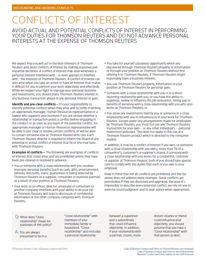 RECOGNIZING AND AVOIDING CONFLICTS CONFLICTS OF INTEREST AVOID ACTUAL AND POTENTIAL CONFLICTS OF INTEREST IN PERFORMING YOUR DUTIES FOR THOMSON REUTERS AND DO NOT ADVANCE PERSONAL INTERESTS AT THE EXPENSE OF THOMSON REUTERS We expect that you will act in the best interests of Thomson Reuters and avoid conflicts of interest by making reasoned and impartial decisions. A conflict of interest may arise whenever a personal interest interferes with - or even appears to interfere with - the interests of Thomson Reuters. A conflict of interest can also arise when you take an action or have an interest that makes it difficult for you to perform your work objectively and effectively. While we respect your right to manage your personal business and investments, you should place Thomson Reuters interest in any business transaction ahead of any personal interest or gain. Identify and pre-clear conflicts – It’s your responsibility to identify potential conflicts when they arise and to notify in writing an appropriate manager, Human Resources representative or a lawyer who supports your business if you are unsure whether a relationship or transaction poses a conflict before engaging in the conduct or as soon as you learn of the potential conflict. An appropriate manager or Human Resources representative will be able to pre-clear or resolve certain conflicts, or will be able to contact someone else at Thomson Reuters who can. Each Thomson Reuters director is required to inform the Board of any potential or actual conflict of interest that he or she may have with Thomson Reuters. Examples of conflicts – The following are examples of conflicts of interest that could arise, and are prohibited unless they have been pre-cleared or resolved in advance: • You or someone with a close relationship with you receives improper personal benefits (such as cash, gifts, entertainment, services, discounts, loans, guarantees or being selected by Thomson Reuters as a supplier, consultant or business partner) as a result of your position at Thomson Reuters; • Your work as an officer, director, employee or consultant to another company interferes with your ability to do your job at Thomson Reuters, will lead to disclosure of confidential information or the other company competes with Thomson Reuters; • You take for yourself a business opportunity which you discovered through Thomson Reuters property or information or through your position at Thomson Reuters without first offering it to Thomson Reuters, if Thomson Reuters might reasonably have a business interest; • You use Thomson Reuters property, information or your position at Thomson Reuters for personal gain; • Someone with a close relationship with you is in a direct reporting relationship with you, or you have the ability to supervise, review or influence the job evaluation, hiring, pay or benefits of someone with a close relationship with you who also works at Thomson Reuters; or • You allow any investments held by you or someone in a close relationship with you to influence you in your work for Thomson Reuters. Except under any arrangements made for employees by Thomson Reuters, you must not use any Thomson Reuters transaction for your own – or any other individual’s – personal investment purposes. This does not apply to the use of a Thomson Reuters product which is directed to the consumer market. In addition, it may be a conflict of interest if you own, or someone with a close relationship with you owns, more than 1% of a competitor’s, customer’s or supplier’s shares. If someone with a close relationship with you works for a competitor, customer or supplier of Thomson Reuters, both of you should take special care to comply with the duties that each of you owe to your employer. Keep in mind that not all conflicts are prohibited and the list above does not address every example. Some conflicts are permissible if they are disclosed and approved. Because it’s impossible to describe every potential conflict, we rely on you to exercise sound judgment and to seek advice when appropriate. Q: What does “close relationship” mean for purposes of this policy? A: You are always presumed to be in a “close relationship” with members of your immediate family or household. “Close relationship” also includes a personal relationship between a supervisor and a subordinate that could influence objectivity. In addition, if your relationship with a partner, cousin, more distant relative or friend could influence your objectivity, you should assume that you have a “close relationship” with that person as well. 31Thomson Reuters | Code of Business Conduct and Ethics Code of Business Conduct and Ethics on ThomsonReuters.com (external) Code of Business Conduct and Ethics on the HUB (internal) Business Conduct and Ethics Hotline on the HUB (internal)