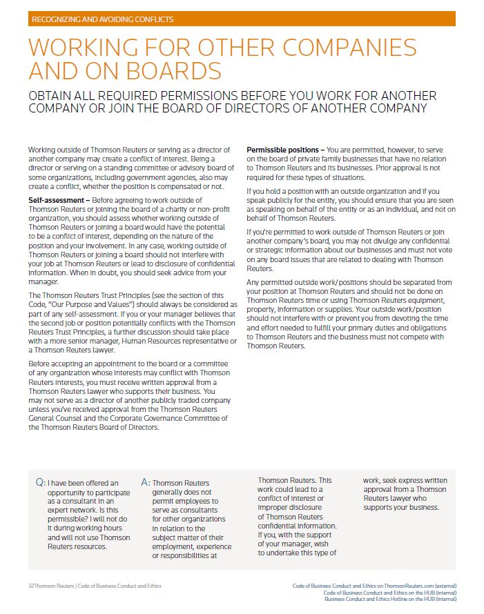 RECOGNIZING AND AVOIDING CONFLICTS WORKING FOR OTHER COMPANIES AND ON BOARDS OBTAIN ALL REQUIRED PERMISSIONS BEFORE YOU WORK FOR ANOTHER COMPANY OR JOIN THE BOARD OF DIRECTORS OF ANOTHER COMPANY Working outside of Thomson Reuters or serving as a director of another company may create a conflict of interest. Being a director or serving on a standing committee or advisory board of some organizations, including government agencies, also may create a conflict, whether the position is compensated or not. Self-assessment – Before agreeing to work outside of Thomson Reuters or joining the board of a charity or non-profit organization, you should assess whether working outside of Thomson Reuters or joining a board would have the potential to be a conflict of interest, depending on the nature of the position and your involvement. In any case, working outside of Thomson Reuters or joining a board should not interfere with your job at Thomson Reuters or lead to disclosure of confidential information. When in doubt, you should seek advice from your manager. The Thomson Reuters Trust Principles (see the section of this Code, “Our Purpose and Values”) should always be considered as part of any self-assessment. If you or your manager believes that the second job or position potentially conflicts with the Thomson Reuters Trust Principles, a further discussion should take place with a more senior manager, Human Resources representative or a Thomson Reuters lawyer. Before accepting an appointment to the board or a committee of any organization whose interests may conflict with Thomson Reuters interests, you must receive written approval from a Thomson Reuters lawyer who supports their business. You may not serve as a director of another publicly traded company unless you’ve received approval from the Thomson Reuters General Counsel and the Corporate Governance Committee of the Thomson Reuters Board of Directors. Permissible positions – You are permitted, however, to serve on the board of private family businesses that have no relation to Thomson Reuters and its businesses. Prior approval is not required for these types of situations. If you hold a position with an outside organization and if you speak publicly for the entity, you should ensure that you are seen as speaking on behalf of the entity or as an individual, and not on behalf of Thomson Reuters. If you’re permitted to work outside of Thomson Reuters or join another company’s board, you may not divulge any confidential or strategic information about our businesses and must not vote on any board issues that are related to dealing with Thomson Reuters. Any permitted outside work/positions should be separated from your position at Thomson Reuters and should not be done on Thomson Reuters time or using Thomson Reuters equipment, property, information or supplies. Your outside work/position should not interfere with or prevent you from devoting the time and effort needed to fulfill your primary duties and obligations to Thomson Reuters and the business must not compete with Thomson Reuters. Q: I have been offered an opportunity to participate as a consultant in an expert network. Is this permissible? I will not do it during working hours and will not use Thomson Reuters resources. A: Thomson Reuters generally does not permit employees to serve as consultants for other organizations in relation to the subject matter of their employment, experience or responsibilities at Thomson Reuters. This work could lead to a conflict of interest or improper disclosure of Thomson Reuters confidential information. If you, with the support of your manager, wish to undertake this type of work, seek express written approval from a Thomson Reuters lawyer who supports your Thomson Reuters | Code of Business Conduct and Ethics Code of Business Conduct and Ethics on ThomsonReuters.com (external) Code of Business Conduct and Ethics on the HUB (internal) Business Conduct and Ethics Hotline on the HUB (internal)