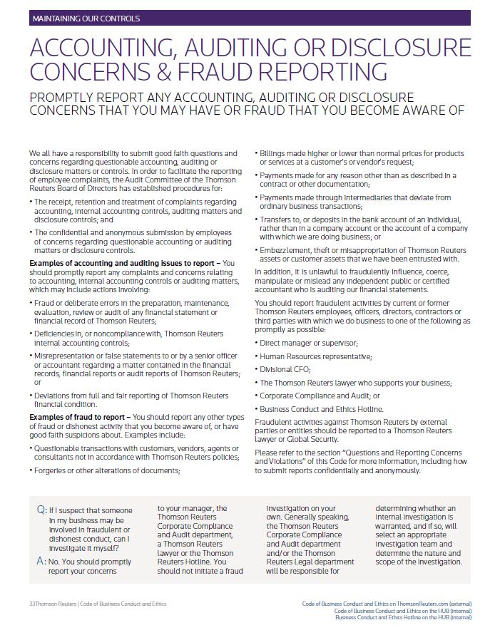 MAINTAINING OUR CONTROLS ACCOUNTING, AUDITING OR DISCLOSURE CONCERNS & FRAUD REPORTING PROMPTLY REPORT ANY ACCOUNTING, AUDITING OR DISCLOSURE CONCERNS THAT YOU MAY HAVE OR FRAUD THAT YOU BECOME AWARE OF We all have a responsibility to submit good faith questions and concerns regarding questionable accounting, auditing or disclosure matters or controls. In order to facilitate the reporting of employee complaints, the Audit Committee of the Thomson Reuters Board of Directors has established procedures for: • The receipt, retention and treatment of complaints regarding accounting, internal accounting controls, auditing matters and disclosure controls; and • The confidential and anonymous submission by employees of concerns regarding questionable accounting or auditing matters or disclosure controls. Examples of accounting and auditing issues to report – You should promptly report any complaints and concerns relating to accounting, internal accounting controls or auditing matters, which may include actions involving: • Fraud or deliberate errors in the preparation, maintenance, evaluation, review or audit of any financial statement or financial record of Thomson Reuters; • Deficiencies in, or noncompliance with, Thomson Reuters internal accounting controls; • Misrepresentation or false statements to or by a senior officer or accountant regarding a matter contained in the financial records, financial reports or audit reports of Thomson Reuters; or • Deviations from full and fair reporting of Thomson Reuters financial condition. Examples of fraud to report – You should report any other types of fraud or dishonest activity that you become aware of, or have good faith suspicions about. Examples include: • Questionable transactions with customers, vendors, agents or consultants not in accordance with Thomson Reuters policies; • Forgeries or other alterations of documents; • Billings made higher or lower than normal prices for products or services at a customer’s or vendor’s request; • Payments made for any reason other than as described in a contract or other documentation; • Payments made through intermediaries that deviate from ordinary business transactions; • Transfers to, or deposits in the bank account of an individual, rather than in a company account or the account of a company with which we are doing business; or • Embezzlement, theft or misappropriation of Thomson Reuters assets or customer assets that we have been entrusted with. In addition, it is unlawful to fraudulently influence, coerce, manipulate or mislead any independent public or certified accountant who is auditing our financial statements. You should report fraudulent activities by current or former Thomson Reuters employees, officers, directors, contractors or third parties with which we do business to one of the following as promptly as possible: • Direct manager or supervisor; • Human Resources representative; • Divisional CFO; • The Thomson Reuters lawyer who supports your business; • Corporate Compliance and Audit; or • Business Conduct and Ethics Hotline. Fraudulent activities against Thomson Reuters by external parties or entities should be reported to a Thomson Reuters lawyer or Global Security. Please refer to the section “Questions and Reporting Concerns and Violations” of this Code for more information, including how to submit reports confidentially and anonymously. Q: If I suspect that someone in my business may be involved in fraudulent or dishonest conduct, can I investigate it myself? A: No. You should promptly report your concerns to your manager, the Thomson Reuters Corporate Compliance and Audit department, a Thomson Reuters lawyer or the Thomson Reuters Hotline. You should not initiate a fraud investigation on your own. Generally speaking, the Thomson Reuters Corporate Compliance and Audit department and/or the Thomson Reuters Legal department will be responsible for determining whether an internal investigation is warranted, and if so, will select an appropriate investigation team and determine the nature and scope of the investigation. Thomson Reuters | Code of Business Conduct and Ethics Code of Business Conduct and Ethics on ThomsonReuters.com (external) Code of Business Conduct and Ethics on the HUB (internal) Business Conduct and Ethics Hotline on the HUB (internal)