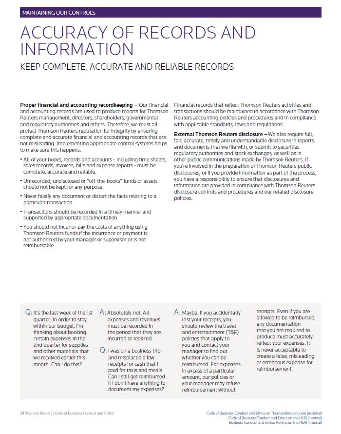 MAINTAINING OUR CONTROLS ACCURACY OF RECORDS AND INFORMATION KEEP COMPLETE, ACCURATE AND RELIABLE RECORDS Proper financial and accounting recordkeeping – Our financial and accounting records are used to produce reports for Thomson Reuters management, directors, shareholders, governmental and regulatory authorities and others. Therefore, we must all protect Thomson Reuters reputation for integrity by ensuring complete and accurate financial and accounting records that are not misleading. Implementing appropriate control systems helps to make sure this happens. • All of your books, records and accounts - including time sheets, sales records, invoices, bills and expense reports - must be complete, accurate and reliable. • Unrecorded, undisclosed or “off-the-books” funds or assets should not be kept for any purpose. • Never falsify any document or distort the facts relating to a particular transaction. • Transactions should be recorded in a timely manner and supported by appropriate documentation. • You should not incur or pay the costs of anything using Thomson Reuters funds if the incurrence or payment is not authorized by your manager or supervisor or is not reimbursable. Financial records that reflect Thomson Reuters activities and transactions should be maintained in accordance with Thomson Reuters accounting policies and procedures and in compliance with applicable standards, laws and regulations. External Thomson Reuters disclosure – We also require full, fair, accurate, timely and understandable disclosure in reports and documents that we file with, or submit to securities regulatory authorities and stock exchanges, as well as in other public communications made by Thomson Reuters. If you’re involved in the preparation of Thomson Reuters public disclosures, or if you provide information as part of the process, you have a responsibility to ensure that disclosures and information are provided in compliance with Thomson Reuters disclosure controls and procedures and our related disclosure policies. Q: It’s the last week of the 1st quarter. In order to stay within our budget, I’m thinking about booking certain expenses in the 2nd quarter for supplies and other materials that we received earlier this month. Can I do this? A: Absolutely not. All expenses and revenues must be recorded in the period that they are incurred or realized. Q: I was on a business trip and misplaced a few receipts for cash that I paid for taxis and meals. Can I still get reimbursed if I don’t have anything to document my expenses? A: Maybe. If you accidentally lost your receipts, you should review the travel and entertainment (T&E) policies that apply to you and contact your manager to find out whether you can be reimbursed. For expenses in excess of a particular amount, our policies or your manager may refuse reimbursement without receipts. Even if you are allowed to be reimbursed, any documentation that you are required to produce must accurately reflect your expenses. It is never acceptable to create a false, misleading or erroneous expense for reimbursement. Thomson Reuters | Code of Business Conduct and Ethics Code of Business Conduct and Ethics on ThomsonReuters.com (external) Code of Business Conduct and Ethics on the HUB (internal) Business Conduct and Ethics Hotline on the HUB (internal)