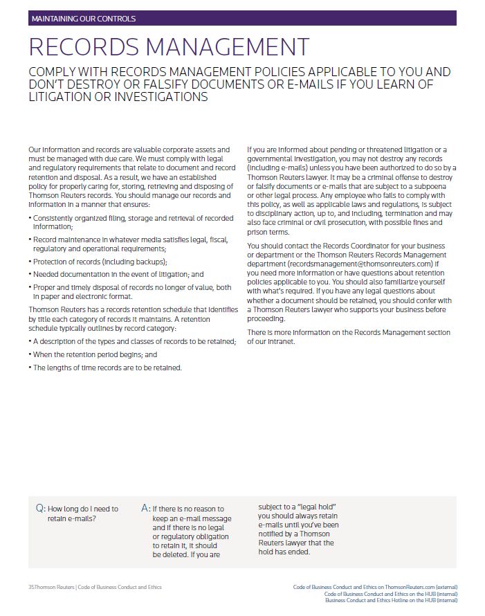 MAINTAINING OUR CONTROLS RECORDS MANAGEMENT COMPLY WITH RECORDS MANAGEMENT POLICIES APPLICABLE TO YOU AND DON’T DESTROY OR FALSIFY DOCUMENTS OR E-MAILS IF YOU LEARN OF LITIGATION OR INVESTIGATIONS Our information and records are valuable corporate assets and must be managed with due care. We must comply with legal and regulatory requirements that relate to document and record retention and disposal. As a result, we have an established policy for properly caring for, storing, retrieving and disposing of Thomson Reuters records. You should manage our records and information in a manner that ensures: • Consistently organized filing, storage and retrieval of recorded information; • Record maintenance in whatever media satisfies legal, fiscal, regulatory and operational requirements; • Protection of records (including backups); • Needed documentation in the event of litigation; and • Proper and timely disposal of records no longer of value, both in paper and electronic format. Thomson Reuters has a records retention schedule that identifies by title each category of records it maintains. A retention schedule typically outlines by record category: • A description of the types and classes of records to be retained; • When the retention period begins; and • The lengths of time records are to be retained. If you are informed about pending or threatened litigation or a governmental investigation, you may not destroy any records (including e-mails) unless you have been authorized to do so by a Thomson Reuters lawyer. It may be a criminal offense to destroy or falsify documents or e-mails that are subject to a subpoena or other legal process. Any employee who fails to comply with this policy, as well as applicable laws and regulations, is subject to disciplinary action, up to, and including, termination and may also face criminal or civil prosecution, with possible fines and prison terms. You should contact the Records Coordinator for your business or department or the Thomson Reuters Records Management department (recordsmanagement@thomsonreuters.com) if you need more information or have questions about retention policies applicable to you. You should also familiarize yourself with what’s required. If you have any legal questions about whether a document should be retained, you should confer with a Thomson Reuters lawyer who supports your business before proceeding. There is more information on the Records Management section of our intranet. Q: How long do I need to retain e-mails? A: If there is no reason to keep an e-mail message and if there is no legal or regulatory obligation to retain it, it should be deleted. If you are subject to a “legal hold” you should always retain e-mails until you’ve been notified by a Thomson Reuters lawyer that the hold has ended. Thomson Reuters | Code of Business Conduct and Ethics Code of Business Conduct and Ethics on ThomsonReuters.com (external) Code of Business Conduct and Ethics on the HUB (internal) Business Conduct and Ethics Hotline on the HUB (internal)