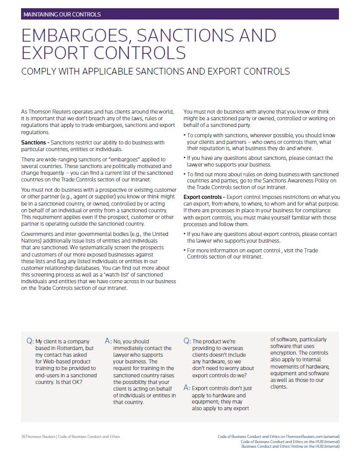 MAINTAINING OUR CONTROLS EMBARGOES, SANCTIONS AND EXPORT CONTROLS COMPLY WITH APPLICABLE SANCTIONS AND EXPORT CONTROLS As Thomson Reuters operates and has clients around the world, it is important that we don’t breach any of the laws, rules or regulations that apply to trade embargoes, sanctions and export regulations. Sanctions - Sanctions restrict our ability to do business with particular countries, entities or individuals. There are wide-ranging sanctions or “embargoes” applied to several countries. These sanctions are politically motivated and change frequently – you can find a current list of the sanctioned countries on the Trade Controls section of our intranet. You must not do business with a prospective or existing customer or other partner (e.g., agent or supplier) you know or think might be in a sanctioned country, or owned, controlled by or acting on behalf of an individual or entity from a sanctioned country. This requirement applies even if the prospect, customer or other partner is operating outside the sanctioned country. Governments and inter-governmental bodies (e.g., the United Nations) additionally issue lists of entities and individuals that are sanctioned. We systematically screen the prospects and customers of our more exposed businesses against these lists and flag any listed individuals or entities in our customer relationship databases. You can find out more about this screening process as well as a ‘watch list’ of sanctioned individuals and entities that we have come across in our business on the Trade Controls section of our intranet. You must not do business with anyone that you know or think might be a sanctioned party or owned, controlled or working on behalf of a sanctioned party. • To comply with sanctions, wherever possible, you should know your clients and partners – who owns or controls them, what their reputation is, what business they do and where. • If you have any questions about sanctions, please contact the lawyer who supports your business. • To find out more about rules on doing business with sanctioned countries and parties, go to the Sanctions Awareness Policy on the Trade Controls section of our intranet. Export controls - Export control imposes restrictions on what you can export, from where, to where, to whom and for what purpose. If there are processes in place in your business for compliance with export controls, you must make yourself familiar with those processes and follow them. • If you have any questions about export controls, please contact the lawyer who supports your business. • For more information on export control , visit the Trade Controls section of our intranet. Q: My client is a company based in Rotterdam, but my contact has asked for Web-based product training to be provided to end-users in a sanctioned country. Is that OK? A: No, you should immediately contact the lawyer who supports your business. The request for training in the sanctioned country raises the possibility that your client is acting on behalf of individuals or entities in that country. Q: The product we’re providing to overseas clients doesn’t include any hardware, so we don’t need to worry about export controls do we? A: Export controls don’t just apply to hardware and equipment; they may also apply to any export of software, particularly software that uses encryption. The controls also apply to internal movements of hardware, equipment and software as well as those to our clients. Thomson Reuters | Code of Business Conduct and Ethics Code of Business Conduct and Ethics on ThomsonReuters.com (external) Code of Business Conduct and Ethics on the HUB (internal) Business Conduct and Ethics Hotline on the HUB (internal)