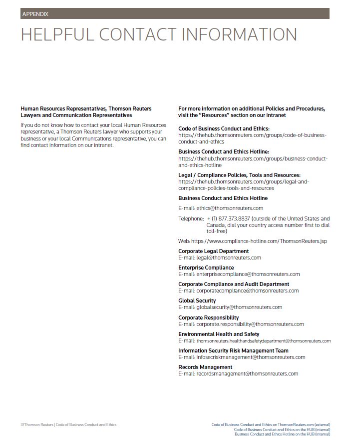 APPENDIX HELPFUL CONTACT INFORMATION Human Resources Representatives, Thomson Reuters Lawyers and Communication Representatives If you do not know how to contact your local Human Resources representative, a Thomson Reuters lawyer who supports your business or your local Communications representative, you can find contact information on our intranet. For more information on additional Policies and Procedures, visit the “Resources” section on our intranet Code of Business Conduct and Ethics: https://thehub.thomsonreuters.com/groups/code-of-business- conduct-and-ethics Business Conduct and Ethics Hotline: https://thehub.thomsonreuters.com/groups/business-conduct- and-ethics-hotline Legal / Compliance Policies, Tools and Resources: https://thehub.thomsonreuters.com/groups/legal-and- compliance-policies-tools-and-resources Business Conduct and Ethics Hotline E-mail: ethics@thomsonreuters.com Telephone: + (1) 877.373.8837 (outside of the United States and Canada, dial your country access number first to dial toll-free) Web: https://www.compliance-hotline.com/ThomsonReuters.jsp Corporate Legal Department E-mail: legal@thomsonreuters.com Enterprise Compliance E-mail: enterprisecompliance@thomsonreuters.com Corporate Compliance and Audit Department E-mail: corporatecompliance@thomsonreuters.com Global Security E-mail: globalsecurity@thomsonreuters.com Corporate Responsibility E-mail: corporate.responsibility@thomsonreuters.com Environmental Health and Safety E-mail: thomsonreuters.healthandsafetydepartment@thomsonreuters.com Information Security Risk Management Team E-mail: infosecriskmanagement@thomsonreuters.com Records Management E-mail: recordsmanagement@thomsonreuters.com Thomson Reuters | Code of Business Conduct and Ethics Code of Business Conduct and Ethics on ThomsonReuters.com (external) Code of Business Conduct and Ethics on the HUB (internal) Business Conduct and Ethics Hotline on the HUB (internal)
