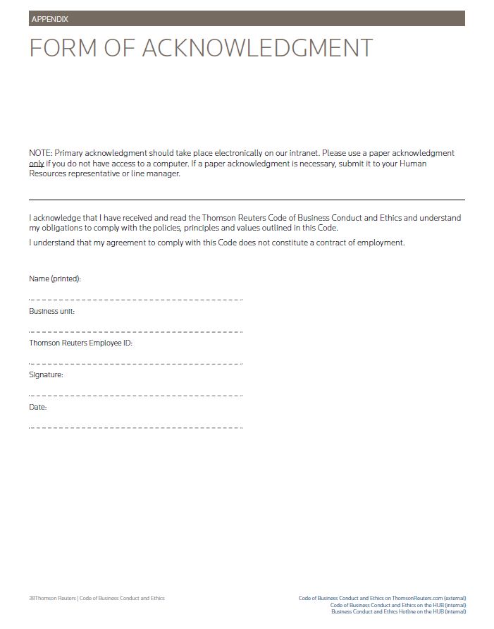 APPENDIX FORM OF ACKNOWLEDGMENT NOTE: Primary acknowledgment should take place electronically on our intranet. Please use a paper acknowledgment only if you do not have access to a computer. If a paper acknowledgment is necessary, submit it to your Human Resources representative or line manager. I acknowledge that I have received and read the Thomson Reuters Code of Business Conduct and Ethics and understand my obligations to comply with the policies, principles and values outlined in this Code. I understand that my agreement to comply with this Code does not constitute a contract of employment. Name (printed): Business unit: Thomson Reuters Employee ID: Signature: Date: Thomson Reuters | Code of Business Conduct and Ethics Code of Business Conduct and Ethics on ThomsonReuters.com (external) Code of Business Conduct and Ethics on the HUB (internal) Business Conduct and Ethics Hotline on the HUB (internal)