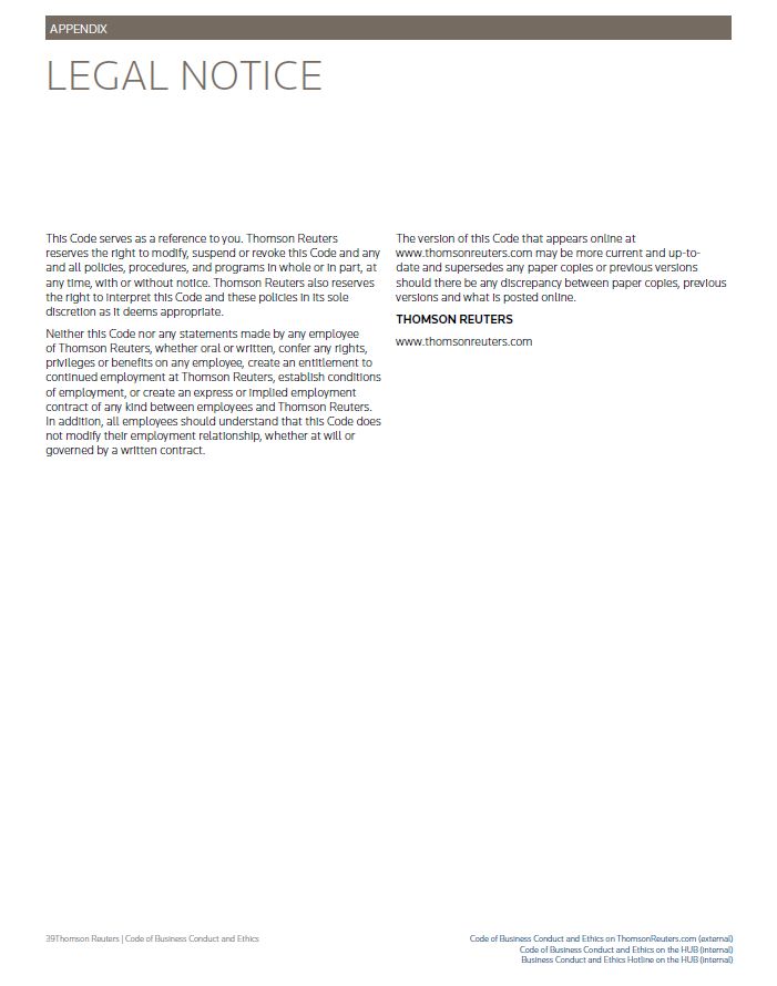 APPENDIX LEGAL NOTICE This Code serves as a reference to you. Thomson Reuters reserves the right to modify, suspend or revoke this Code and any and all policies, procedures, and programs in whole or in part, at any time, with or without notice. Thomson Reuters also reserves the right to interpret this Code and these policies in its sole discretion as it deems appropriate. Neither this Code nor any statements made by any employee of Thomson Reuters, whether oral or written, confer any rights, privileges or benefits on any employee, create an entitlement to continued employment at Thomson Reuters, establish conditions of employment, or create an express or implied employment contract of any kind between employees and Thomson Reuters. In addition, all employees should understand that this Code does not modify their employment relationship, whether at will or governed by a written contract. The version of this Code that appears online at www.thomsonreuters.com may be more current and up-to- date and supersedes any paper copies or previous versions should there be any discrepancy between paper copies, previous versions and what is posted online. THOMSON REUTERS www.thomsonreuters.com Thomson Reuters | Code of Business Conduct and Ethics Code of Business Conduct and Ethics on ThomsonReuters.com (external) Code of Business Conduct and Ethics on the HUB (internal) Business Conduct and Ethics Hotline on the HUB (internal)